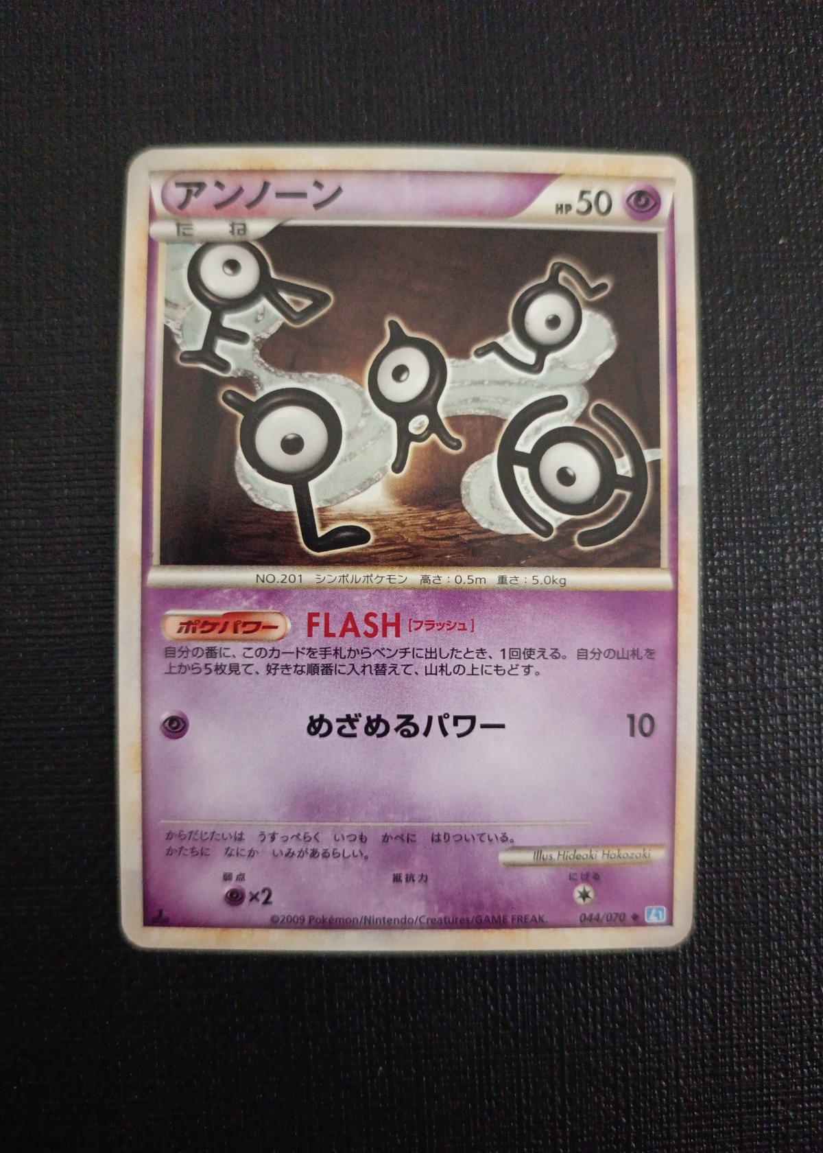 This is a Japanese Unown card from the 2009 Pokémon set, illustrated by Hideaki Hakozaki. The set number is 044/070 and it is part of the HeartGold & SoulSilver era (レジェンド/Legend). The card features the Poké-Power 'FLASH' and an attack valued at 10. Card code: 044/070. Language: Japanese. This card is not foil. It is generally considered collectible rather than highly playable in the current meta. Special feature: Japanese edition.