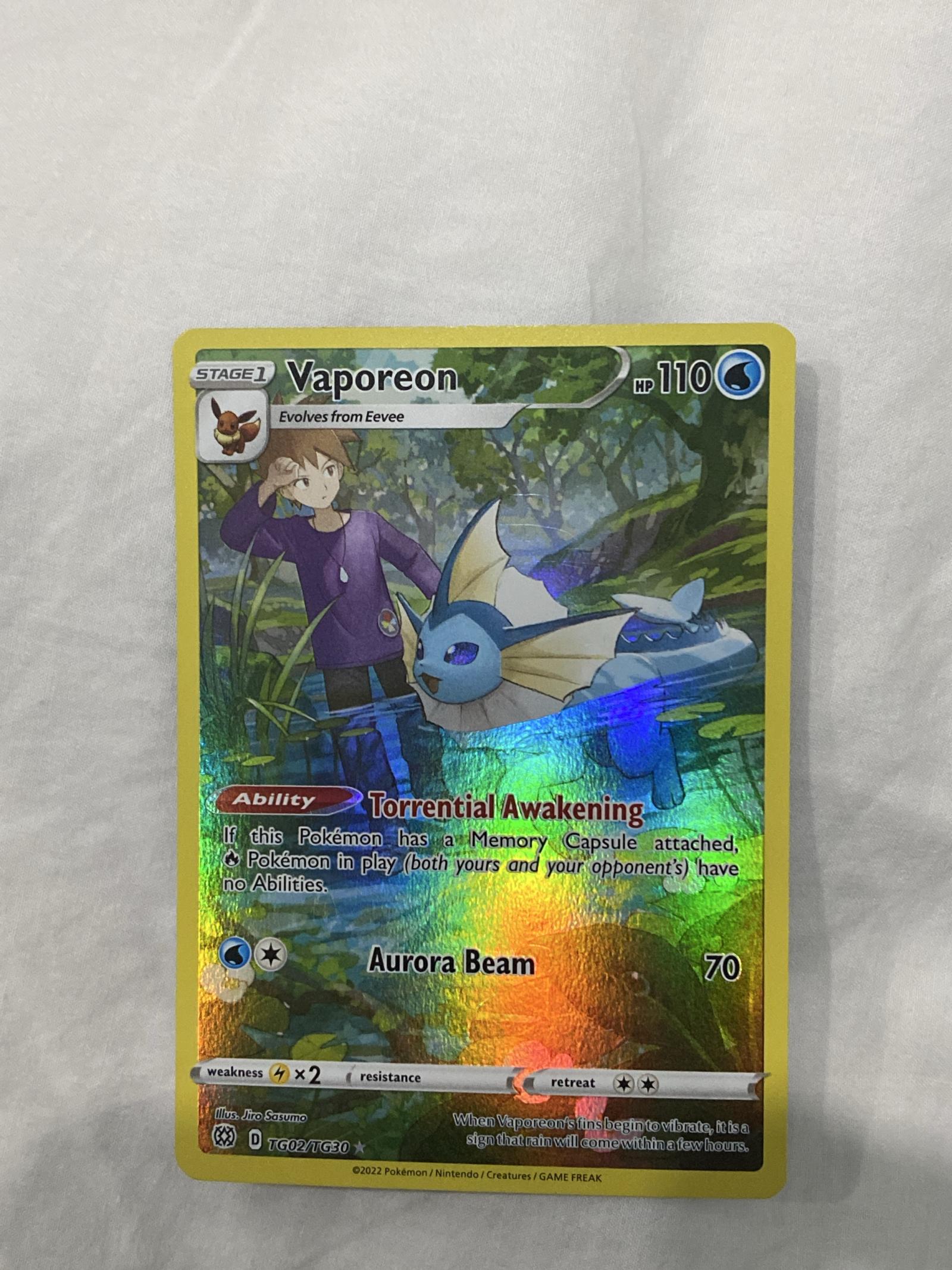 Vaporeon card from the 2022 Pokemon TCG set. Card number TG02. Artist: Jiro Sasumo. Features the Ability Torrential Awakening and attack Aurora Beam. Foil finish that adds a collectible shine. Suitable both for play and collection.