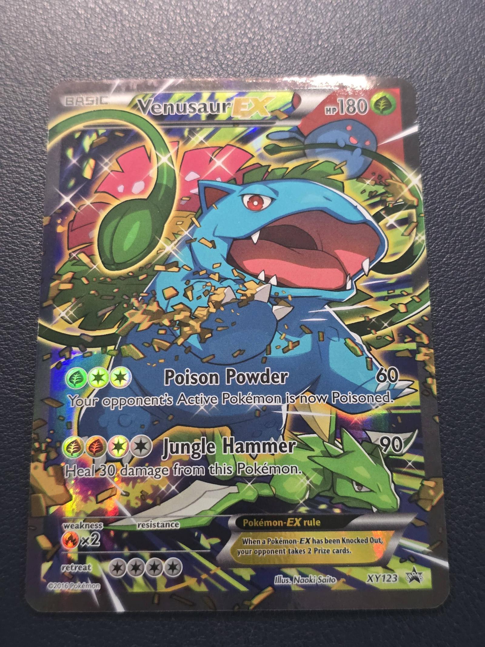 Venusaur EX from the XY set (XY123). Illustrated by Naoki Saito, this powerful card has 180 HP and features the Poison Powder and Jungle Hammer attacks. The card is holofoil and features a full-art design. Released in 2016, it is playable in the Pokemon TCG meta and is highly sought after by collectors.
