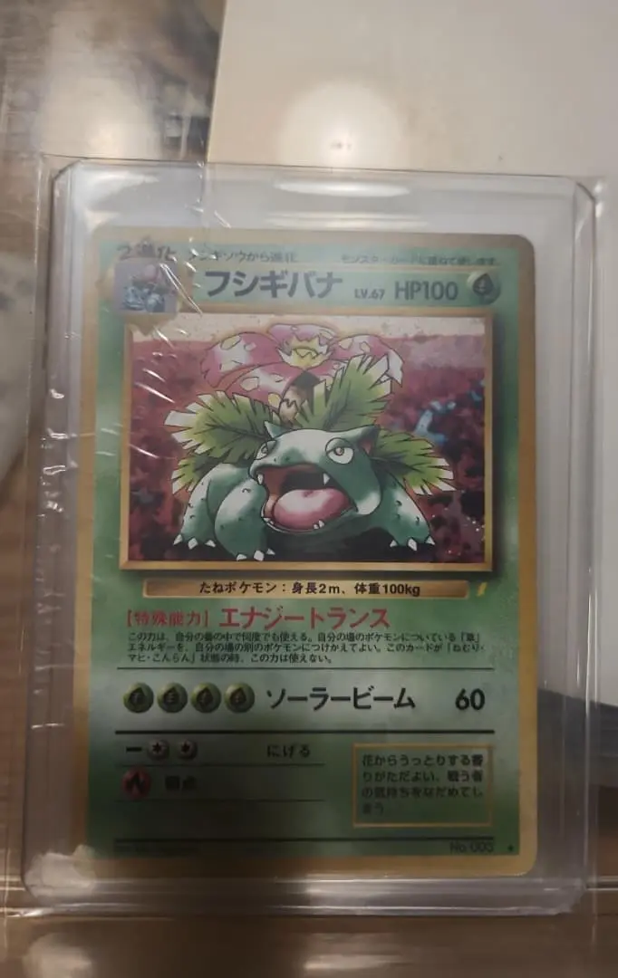 - This is primarily a vintage/collector piece rather than a current tournament play card due to language and set vintage. It will be of interest to collectors of early Japanese Pokémon cards, Venusaur fans, and those seeking raw candidates for professional grading. Condition issues (edge wear, possible surface scuffs from sleeve) will affect grading outcome, so prices should reflect an ungraded, raw condition.