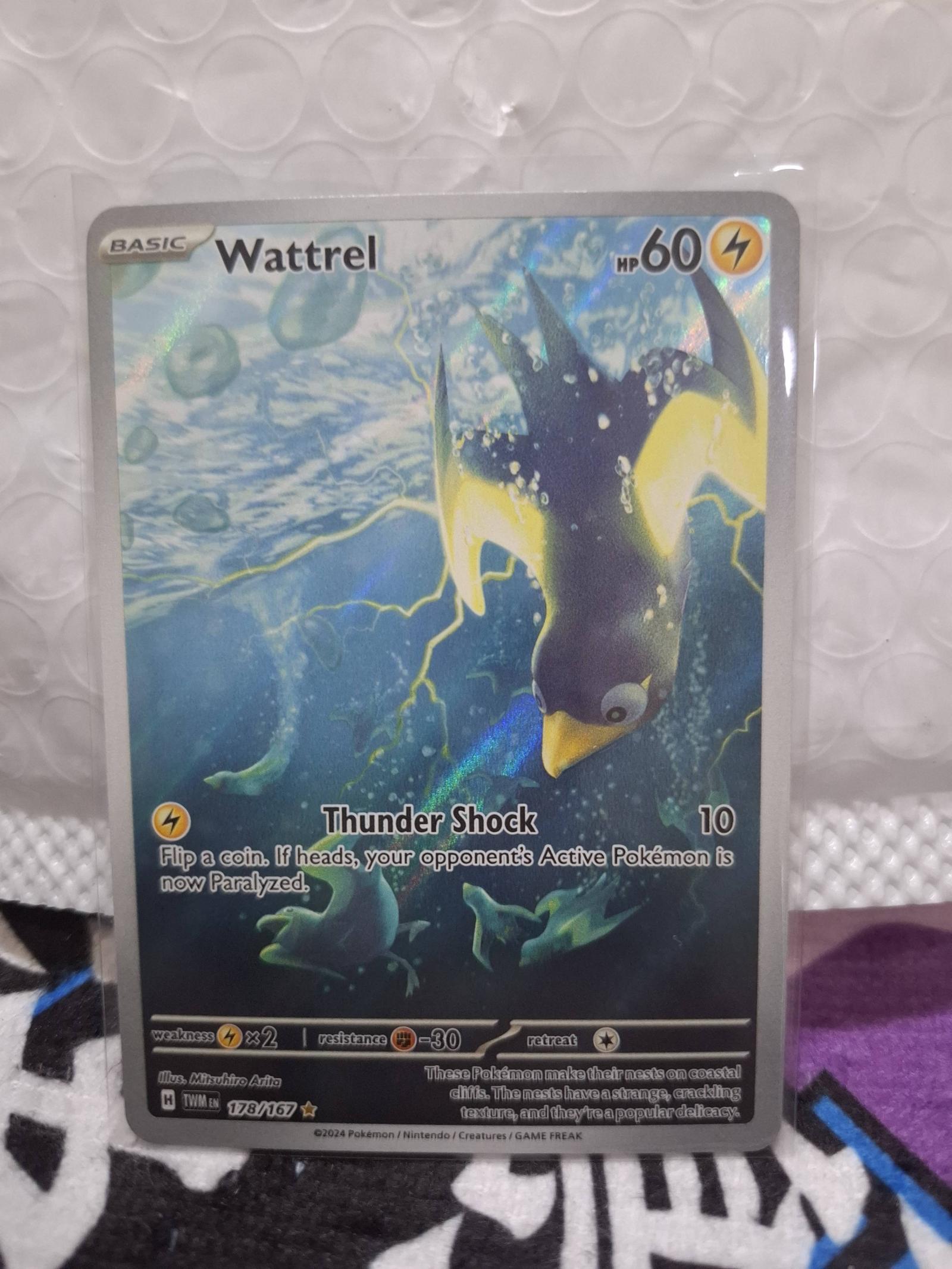 Wattrel card (178/167) from the TWM set, illustrated by Mitsuhiro Arita. This holo foil card is a rare collectible featuring the Thunder Shock attack. Playable in the current meta as a basic electric-type Pokémon. Set name: TWM. Card code: 178167.