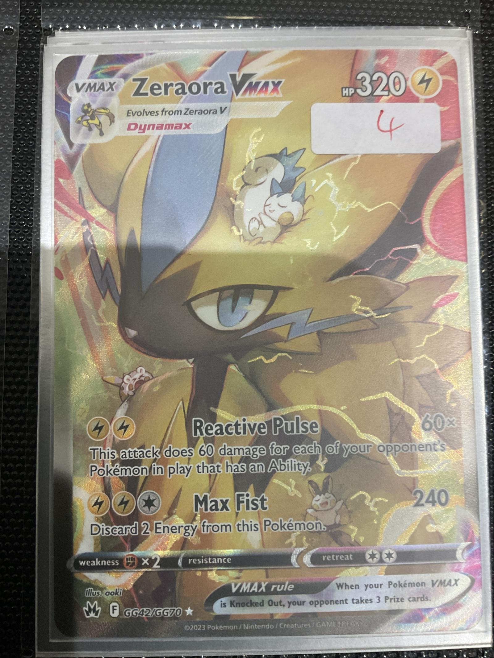 Zeraora VMAX from the Pokemon 2023 set GG42/GG70. Artwork by ookii. This is a full art foil card with 320 HP. Features attacks Reactive Pulse and Max Fist. A playable card in the competitive meta, especially noted for its high damage and energy discard mechanics. Card code: GG42/GG70.