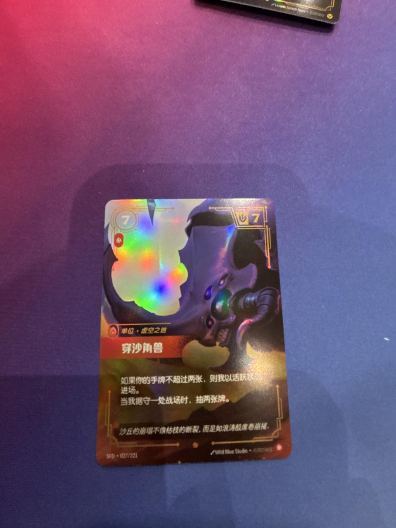 This is a Riftbound trading card featuring 穿沙角兽 with holographic foil detailing. Text is in Chinese. The card shows some visible surface creasing which impacts its visual appeal.