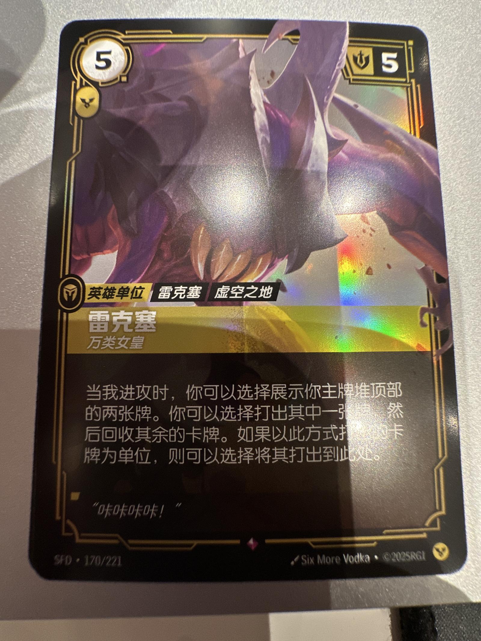 A holographic Riftbound trading card featuring 雷克塞 (Rex) with detailed artwork and Chinese text. This collectible card is numbered 170 out of 221 in the set. The card has vibrant foil highlights and clear, legible text, suitable for collectors and players.