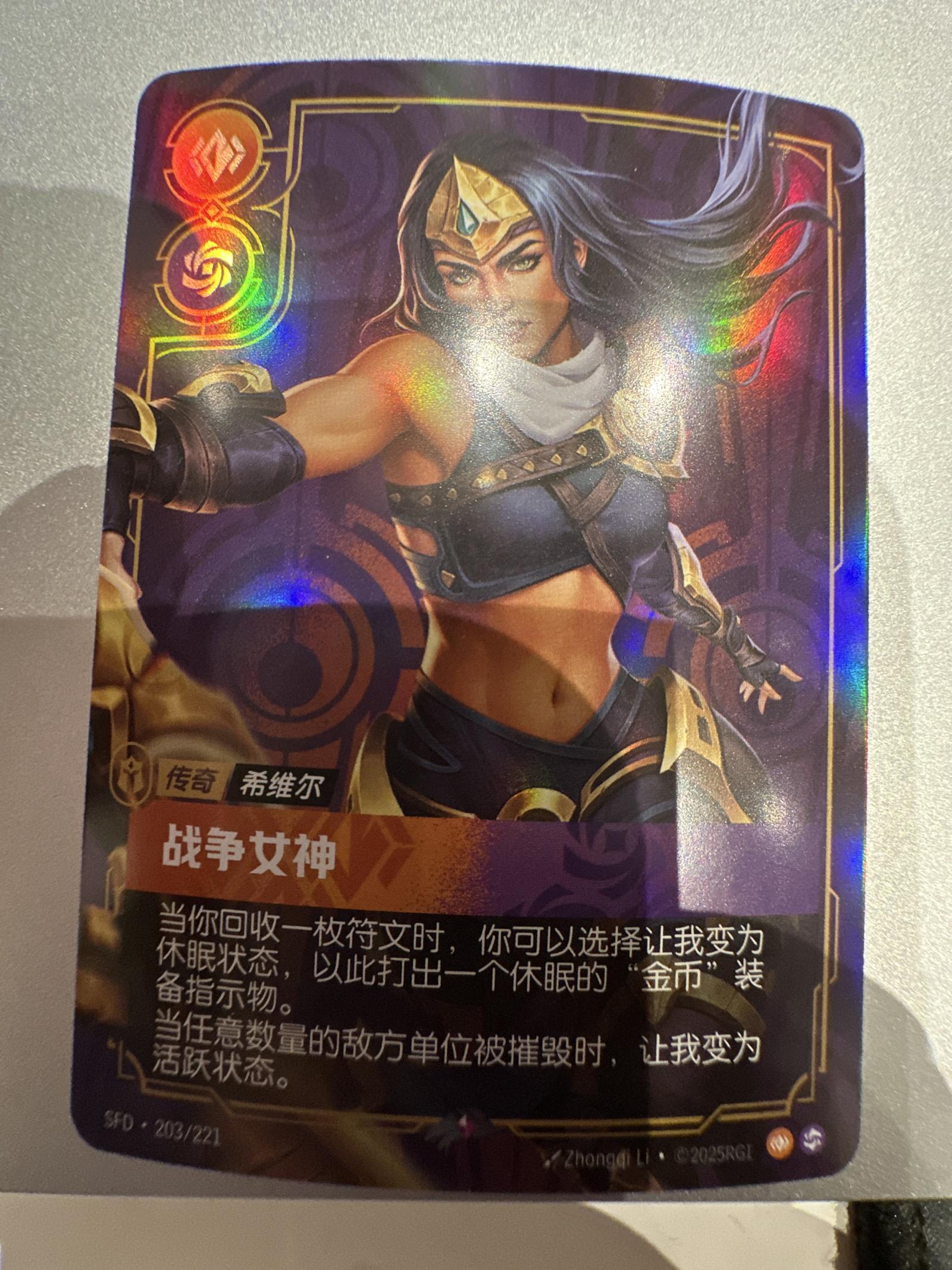 This is a holographic legendary Riftbound trading card featuring the character 战争女神 (War Goddess). The card text is in Chinese and describes special abilities related to dormancy and activation states in gameplay. It is card number 203 out of 221 in the set, illustrated by Zhongqi Li and officially licensed by SRGI.