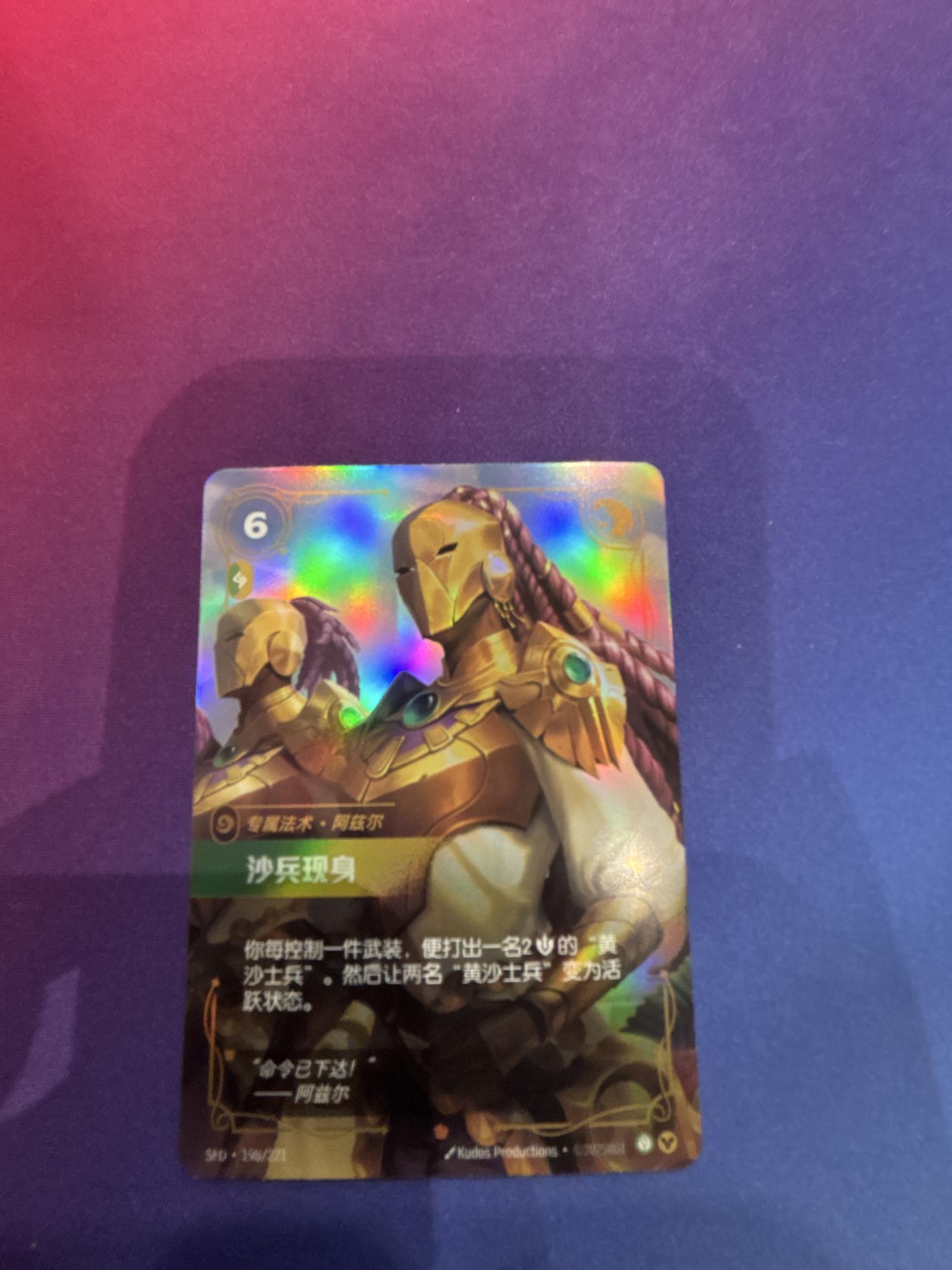 This holographic Riftbound trading card features the Sand Soldier Summon character with gold armor and intricate design. The card text is in Chinese and includes unique game abilities. The holographic finish is vibrant, enhancing the detailed artwork. Perfect for collectors and players alike.
