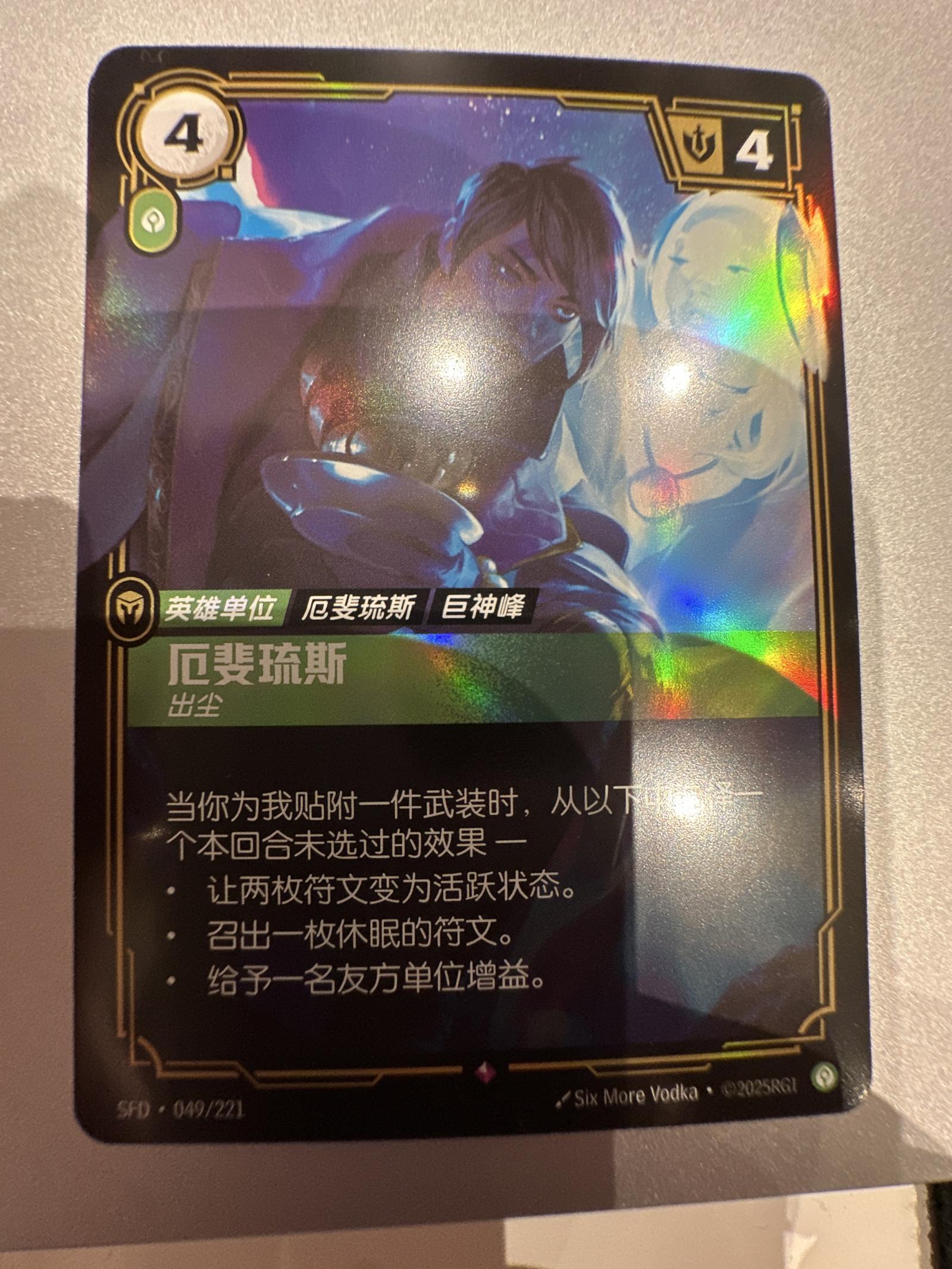 A holographic Riftbound trading card featuring a hero unit with detailed artwork and Chinese text. The card has a clear shine with minor reflections visible in the photo. Perfect for collectors of Riftbound or fans of unique holographic cards.