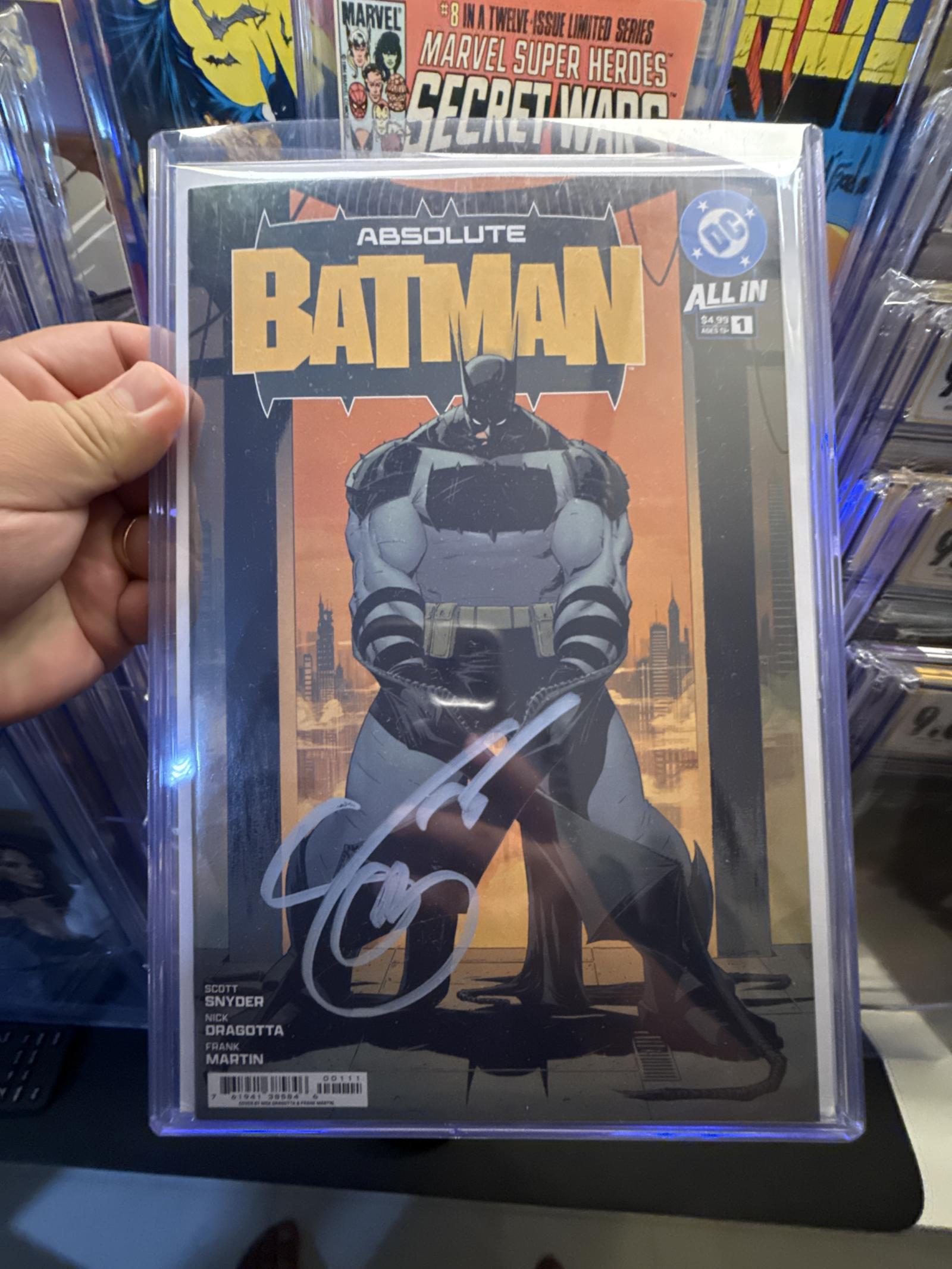 Absolute Batman #1, signed by writer Scott Snyder. This comic features art by Nick Dragotta and Frank Martin. The cover showcases a powerful image of Batman, with the signature prominently displayed on the front. A must-have collectible for Batman fans and comic book collectors.