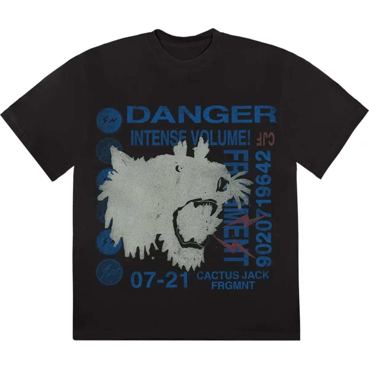 Bold graphics play a role in every apparel piece by Travis Scott. Created for the FW21 season, the Cactus Jack by Travis Scott For Fragment Danger Tee 'Black' is printed with "Danger Intense Volume," a roaring lion on the front and a lightning strike on the back, among other text phrases.