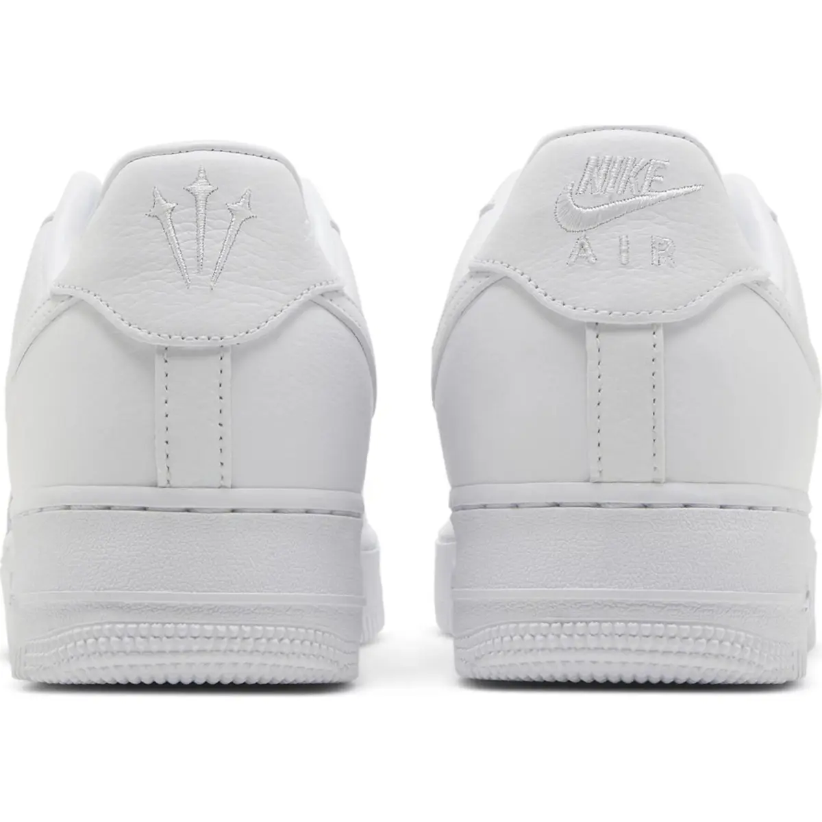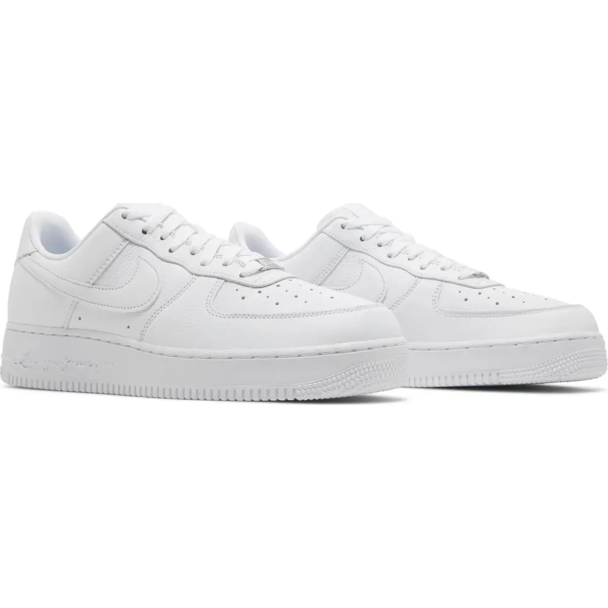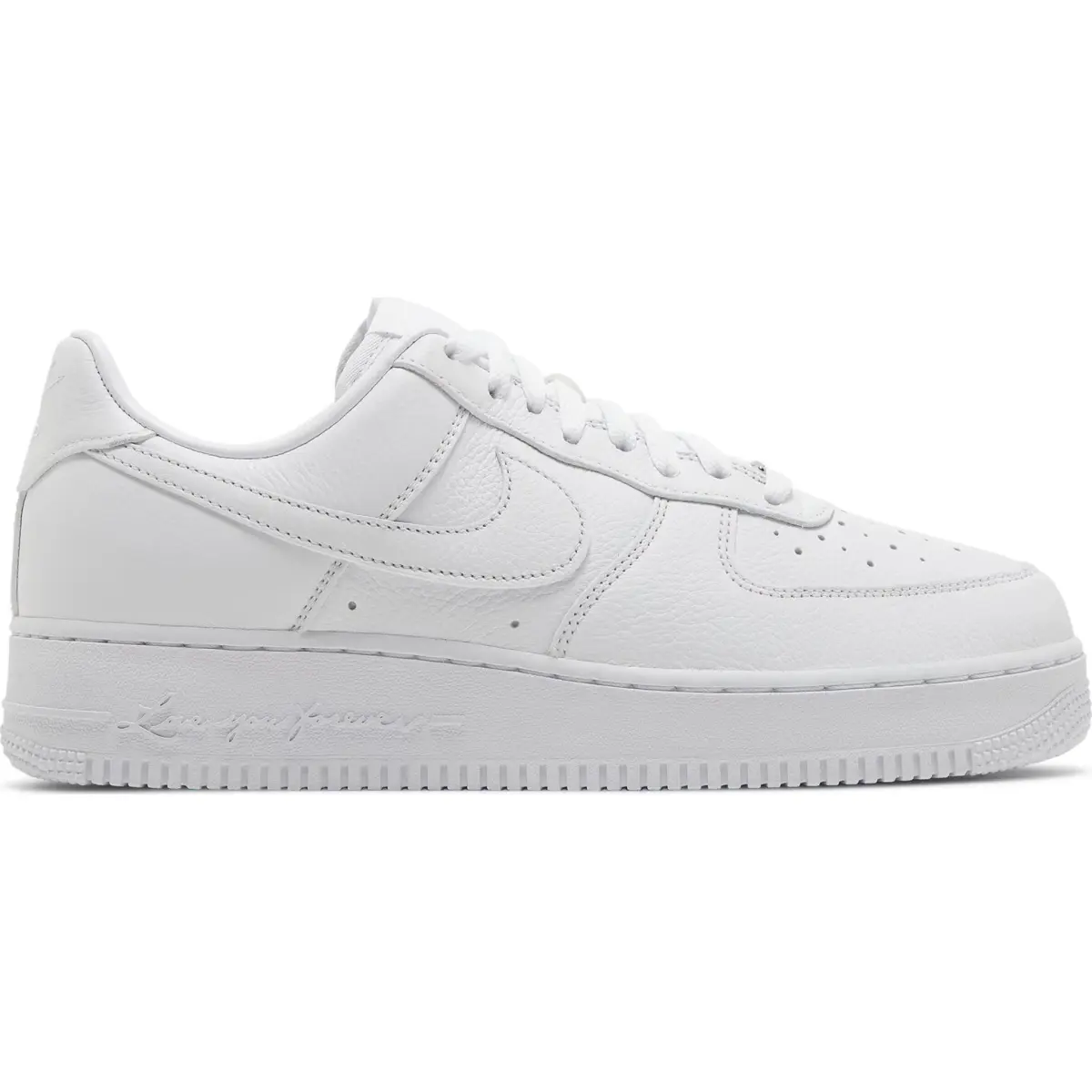 The white-on-white AF1 colorway gets a modest Drake update on the NOCTA x Nike Air Force 1 Low "Certified Lover Boy." The low-top has a white tumbled leather upper with tonal Swooshes, mismatched NOCTA and Nike Air branding on each heel tab, and a white tumbled leather sole. A low-cut padded collar, variable width lacing, and a perforated toe box are examples of heritage details. The vintage basketball shoe is set on a white midsole with matching embossed lettering that reads "Love You Forever" across the lateral sidewall.