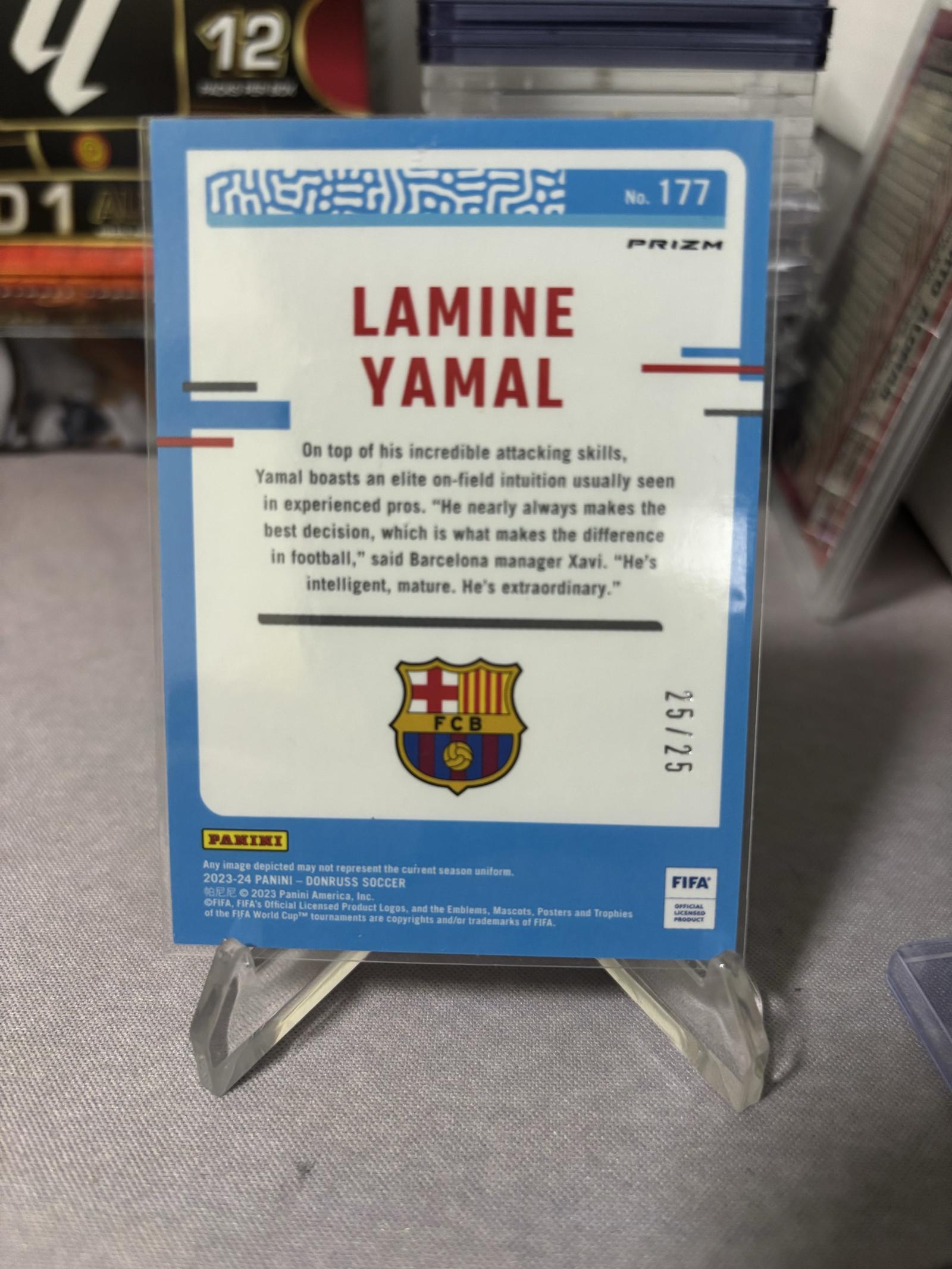 A limited edition 2023-24 Donruss Optic soccer card featuring Lamine Yamal of FC Barcelona. This Rated Rookie Pink Prizm card is numbered 25/25, showcasing Yamal in his FC Barcelona kit. The back highlights his exceptional football intelligence with a quote from Barcelona manager Xavi. A highly collectible rookie card for soccer fans and card collectors.
