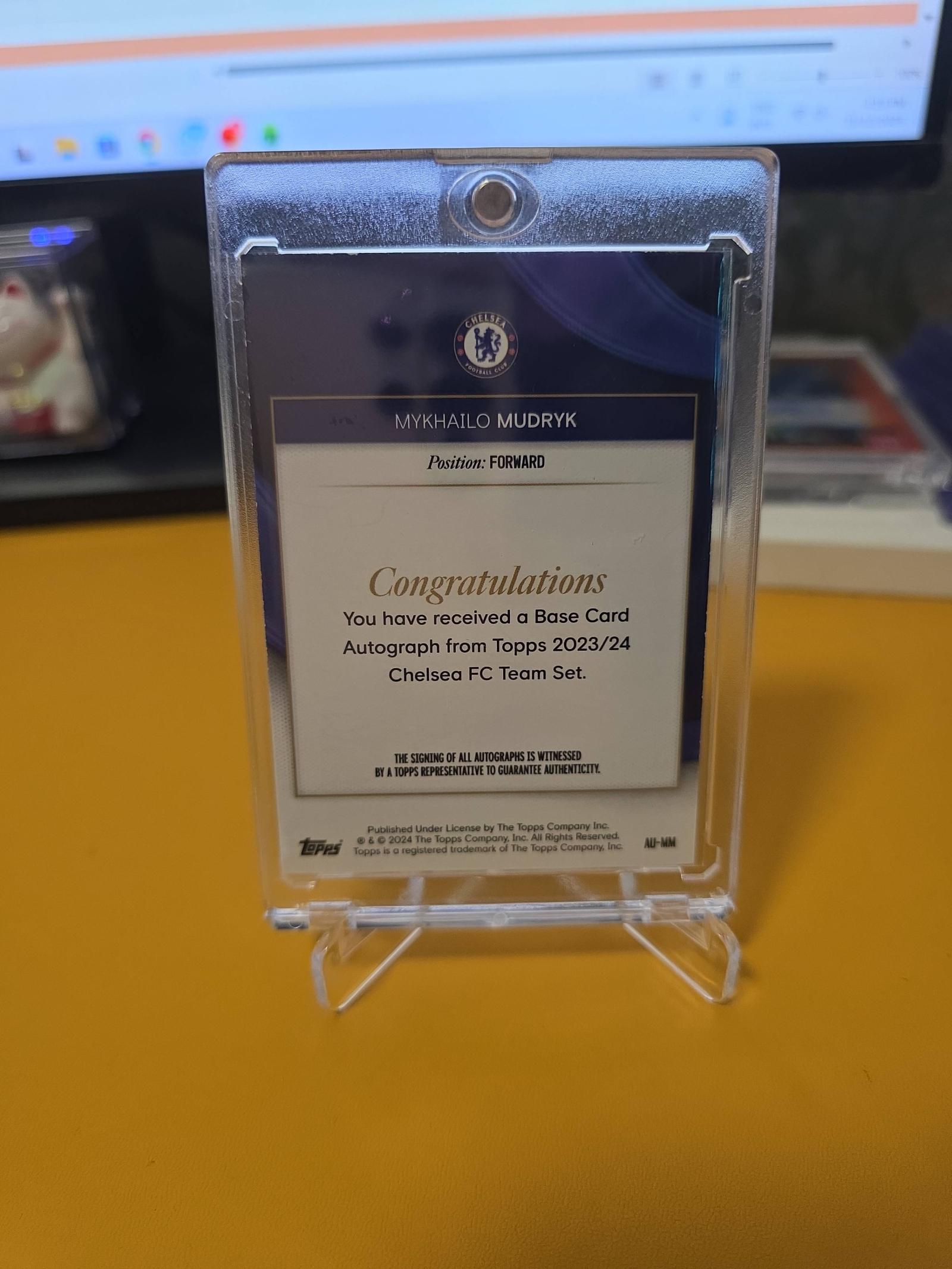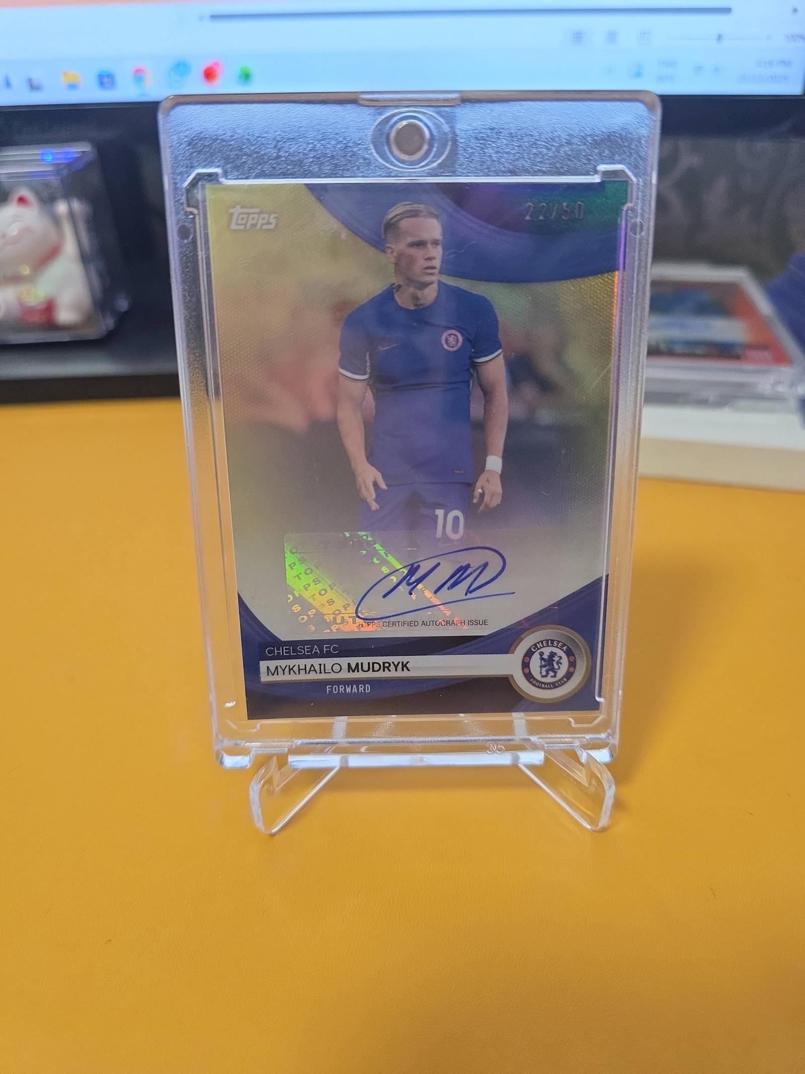 Limited edition Mykhailo Mudryk soccer card from the 2023/24 Topps Chelsea FC Team Set. Numbered 22 out of 50 and featuring a certified autograph. Comes in a protective plastic case for preservation. Card showcases Mudryk in Chelsea's kit, playing as a forward.