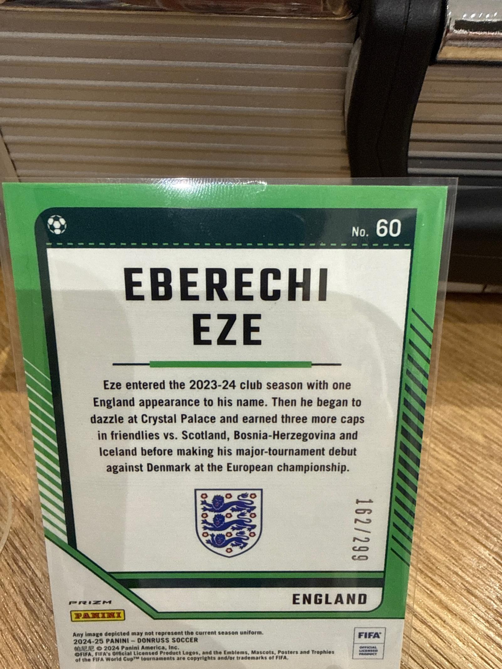 This is a 2024-25 Panini Donruss Soccer card featuring Eberechi Eze, player for England. It is a limited edition Green Prizm parallel numbered 162 out of 299. The card highlights Eze's 2023-24 season achievements including appearances for Crystal Palace and England including the European championship debut against Denmark. A collectible card for soccer fans and card collectors.
