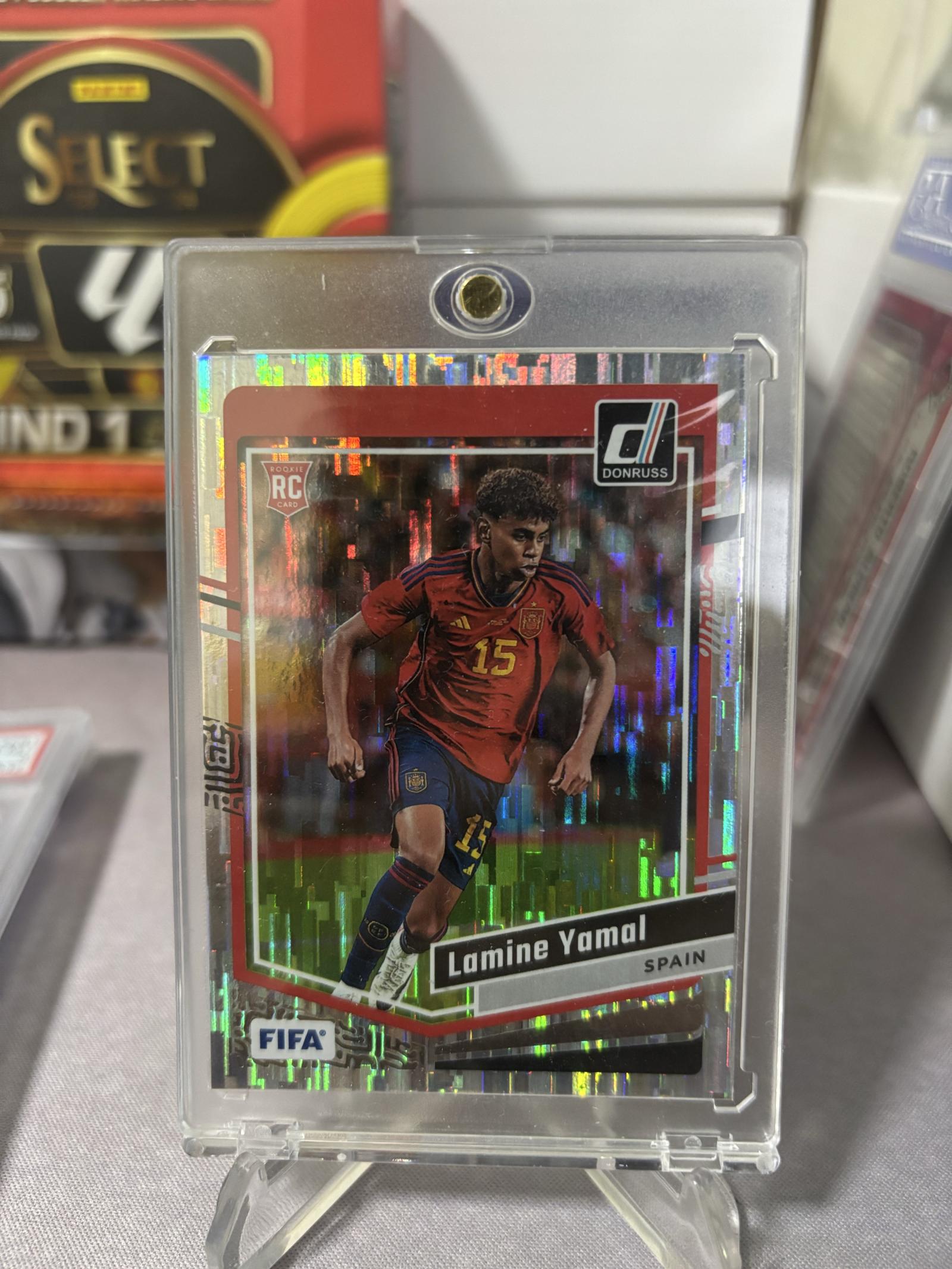 A Donruss rookie card featuring Lamine Yamal from Spain's national soccer team. The card showcases a holographic design and is encased in a protective plastic holder. Ideal for collectors of soccer sports cards.
