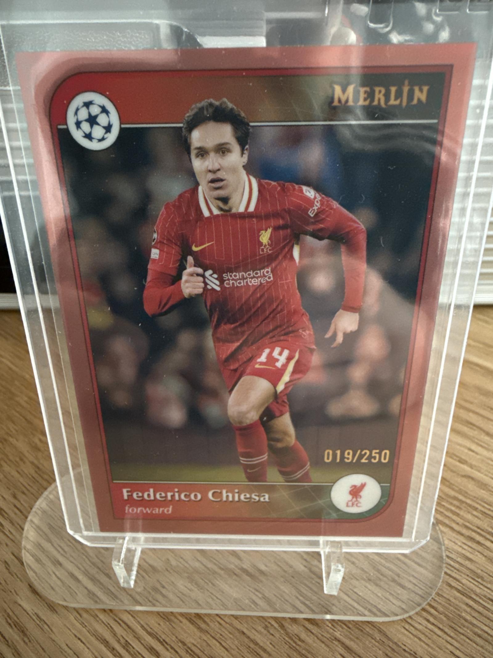 Limited edition Federico Chiesa soccer card from the Merlin series, numbered 019 out of 250. Features Chiesa in Liverpool's red kit as a forward. Card is encased in a protective plastic sleeve for preservation.