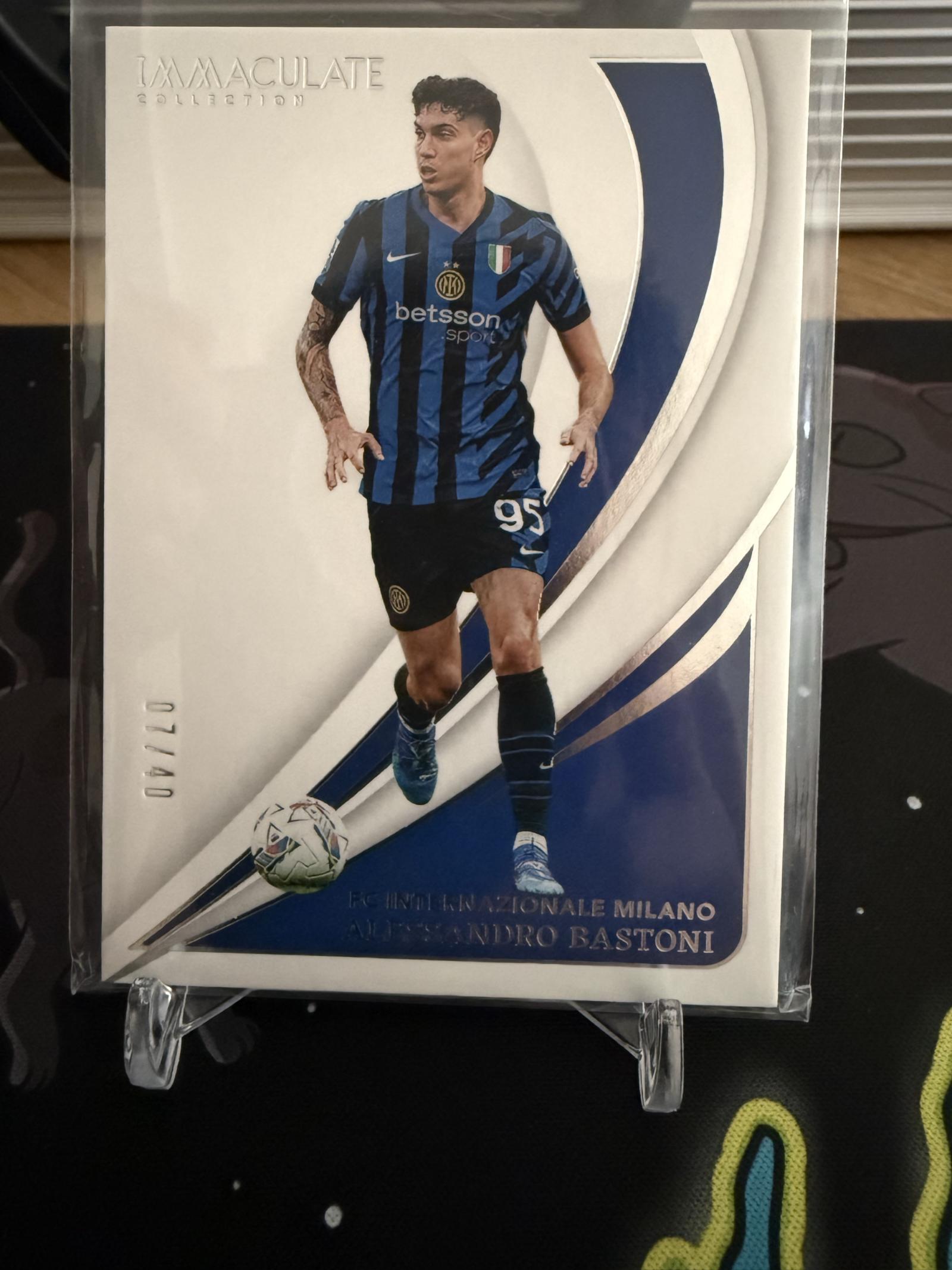A limited edition soccer card from the Immaculate Collection featuring Alessandro Bastoni in Inter Milan kit. Numbered 40, showcasing Bastoni in an action pose with a clean design and premium finish. The card is protected in a sleeve and stand for display.