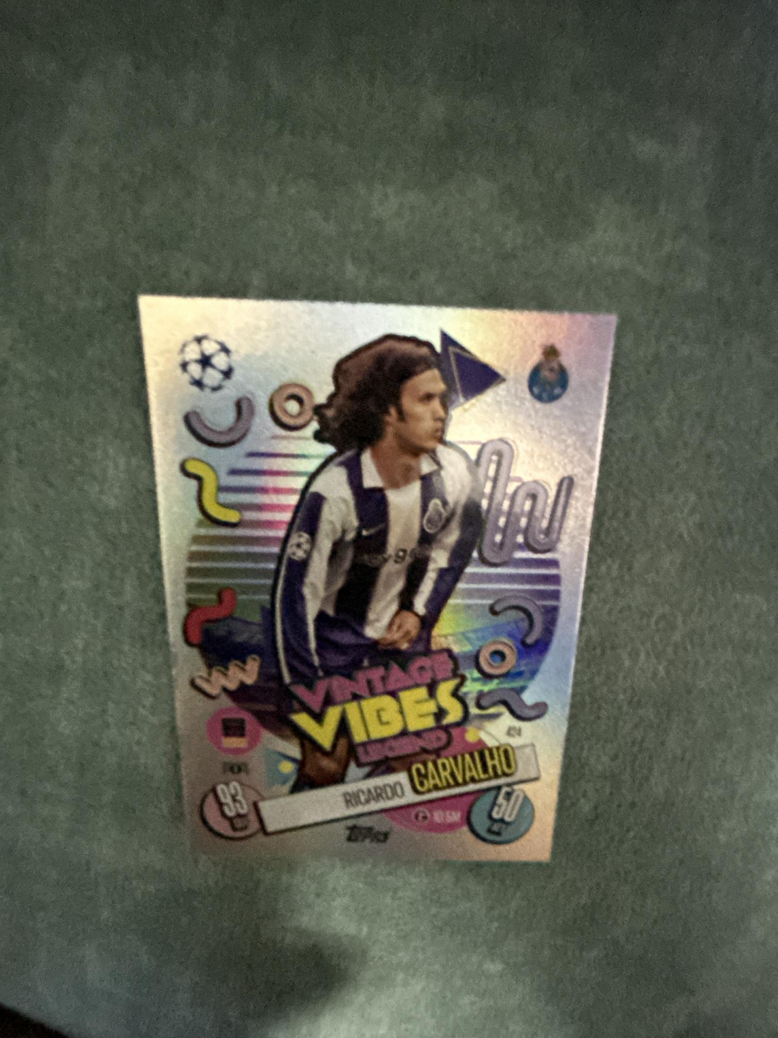 A vibrant 'Vintage Vibes' soccer trading card featuring Ricardo Carvalho in FC Porto kit. Produced by Topps, this card highlights classic and energetic designs with bright holographic effects. A great collectible for fans of the legendary defender and Topps collectors.