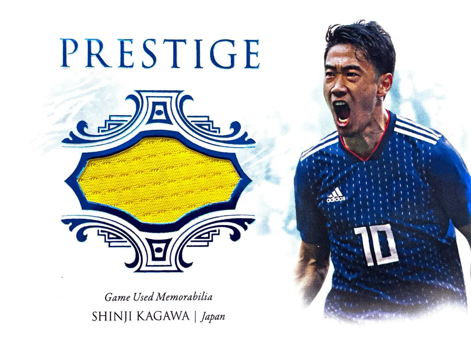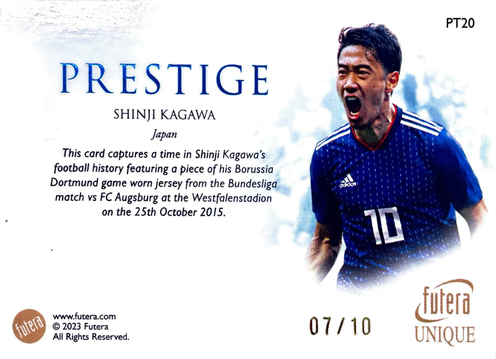 Appearance and presentation: The front features a large, well-centered yellow jersey swatch framed by the PRESTIGE artwork and a full‑color action photo of Kagawa in his national kit. The back includes the Futera branding, a clear description of the game and date, and the gold‑foil 07/10 serial number. Overall this piece presents strongly for display in a memorabilia binder, framed layout, or single‑card protector despite being ungraded.