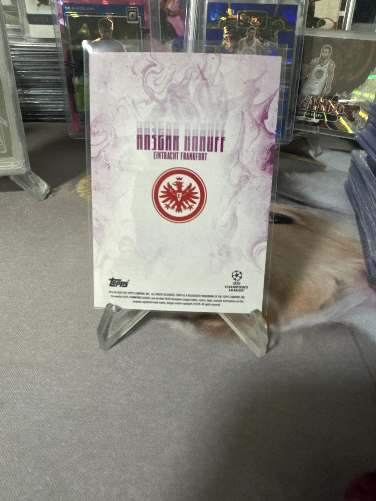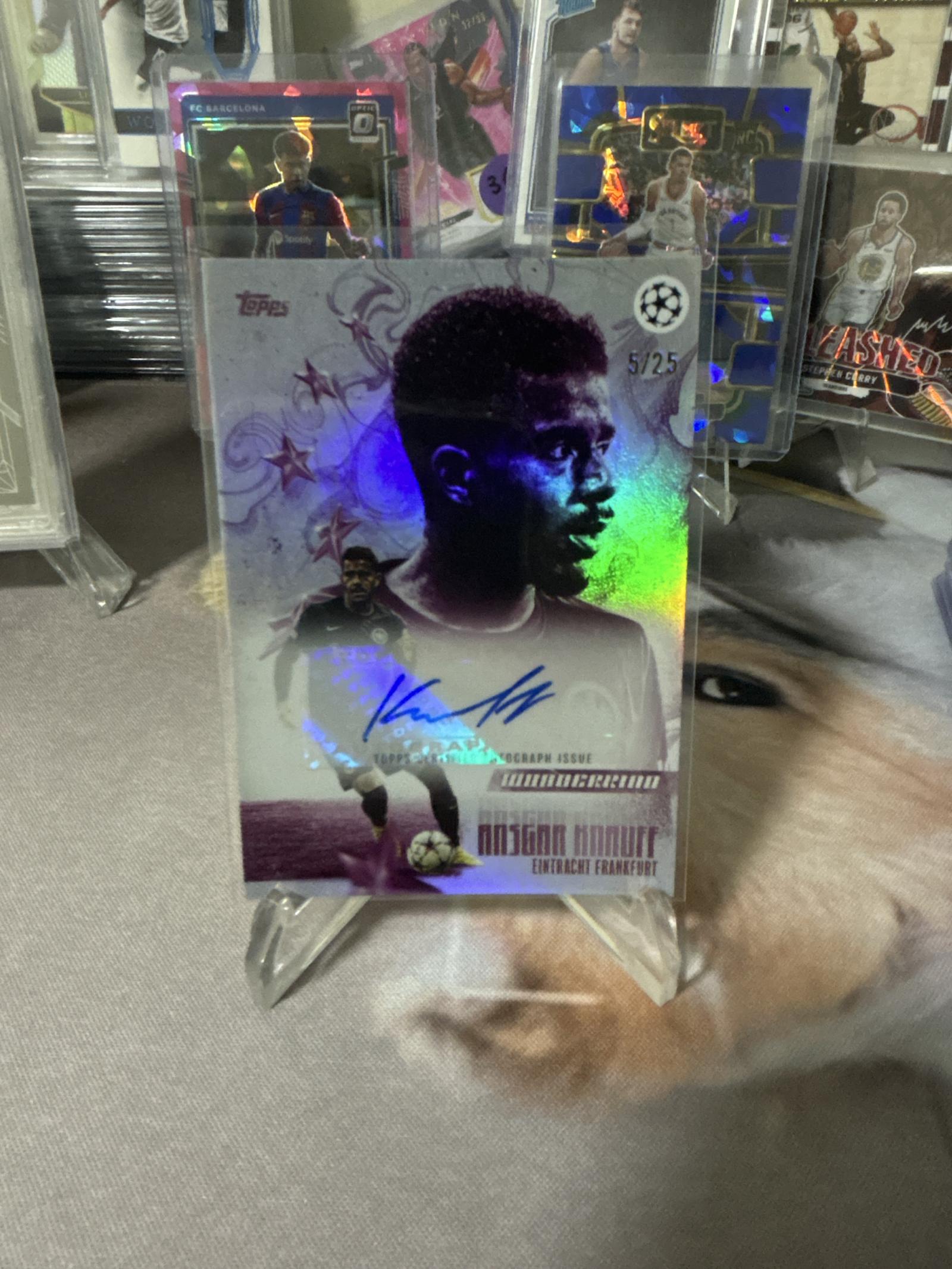 This is a limited edition Topps Champions League soccer card featuring Ansgar Knauff of Eintracht Frankfurt. The card is numbered 5 out of 25 and includes the player's autograph. It has a holographic finish and displays vibrant colors. The card is protected in a plastic case and displayed on a stand. Perfect for collectors of soccer and Champions League memorabilia.