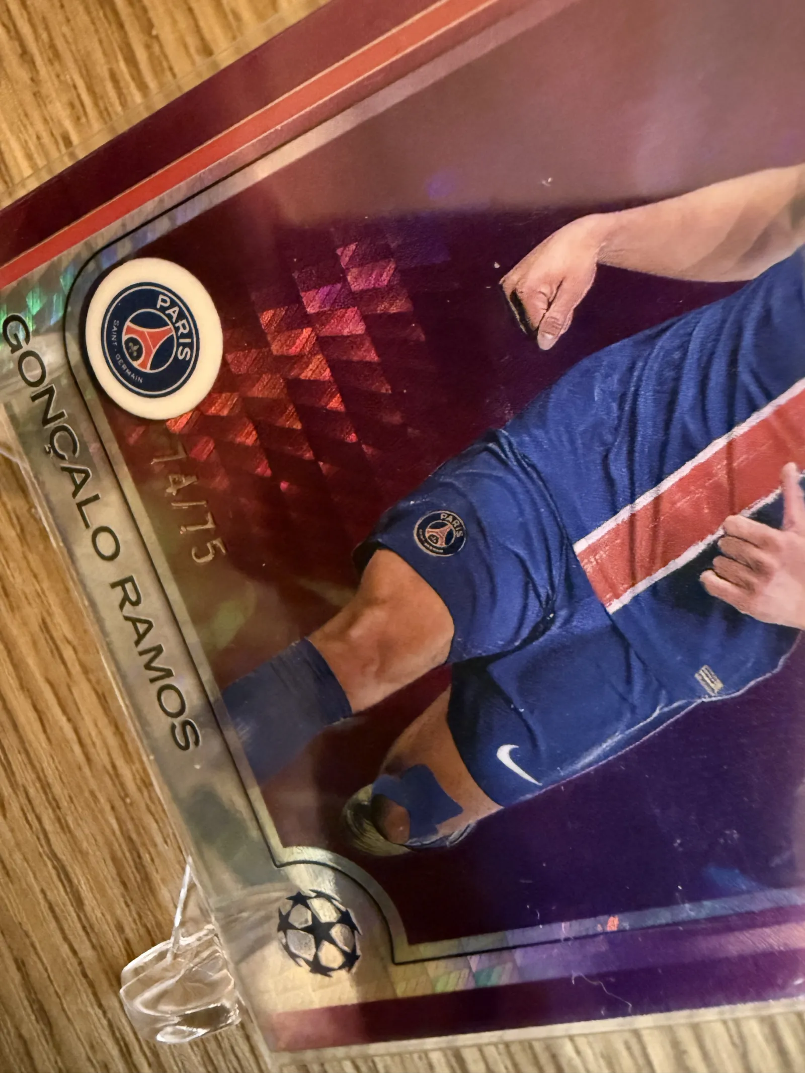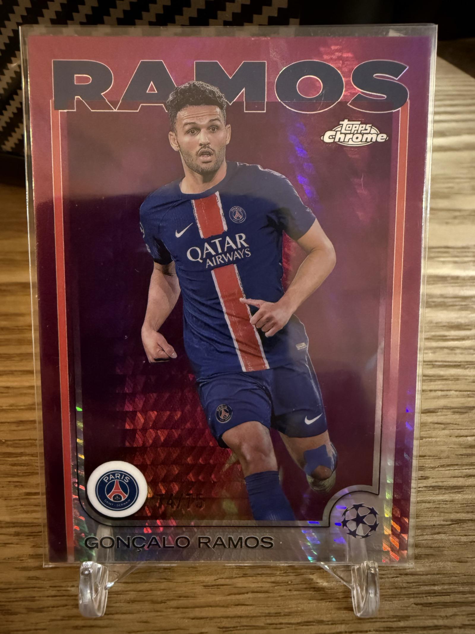 A vibrant Topps Chrome soccer card featuring Goncalo Ramos in Paris Saint-Germain kit. The card showcases a reflective design with red and purple tones, depicting Ramos in action. Ideal for collectors of PSG or international soccer memorabilia.