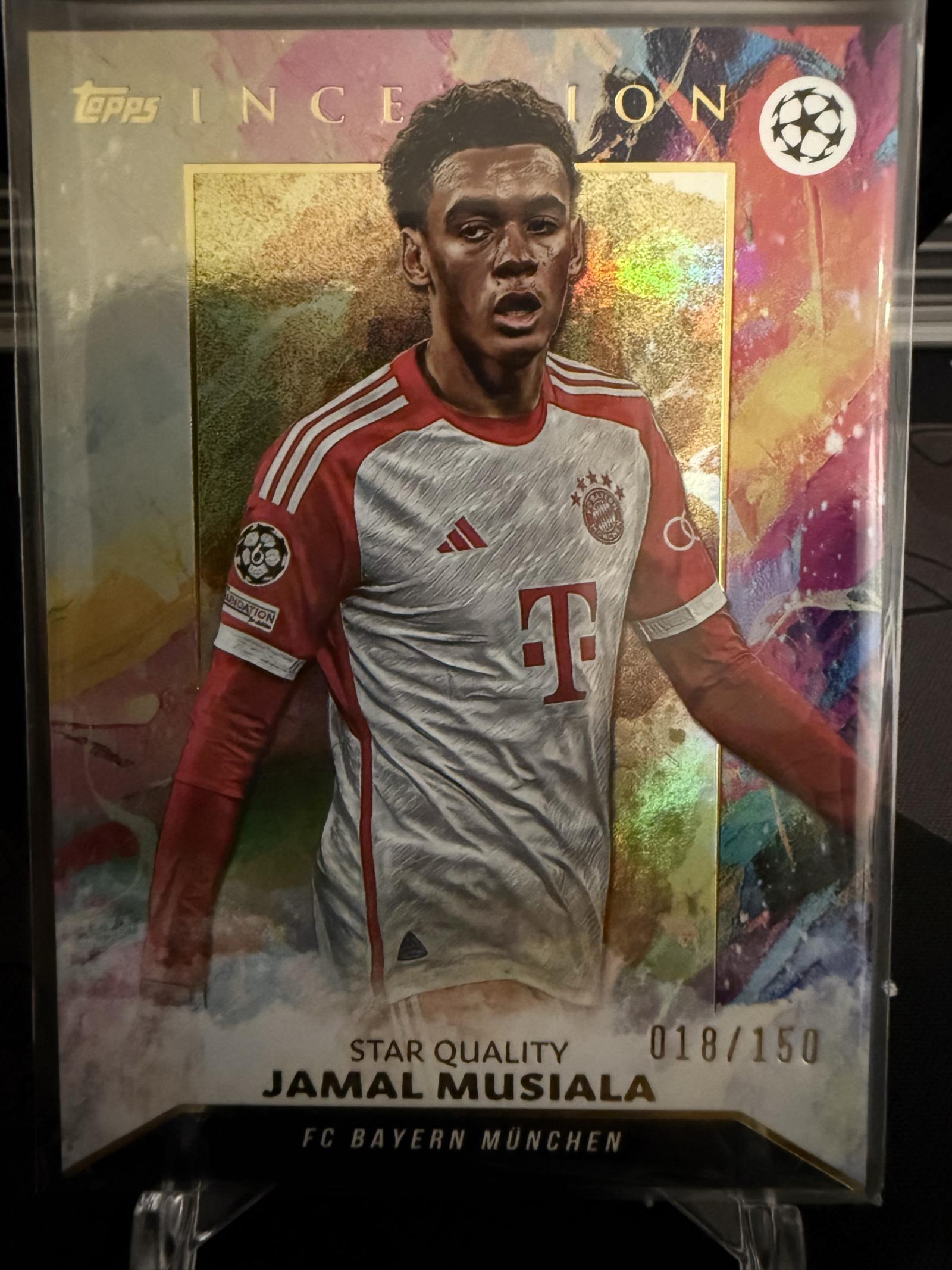 Limited edition Topps Inception soccer card featuring Jamal Musiala of FC Bayern München. This Star Quality card is numbered 018 out of 150, showcasing vibrant artwork and holographic accents. A rare collectible for soccer fans and card collectors.