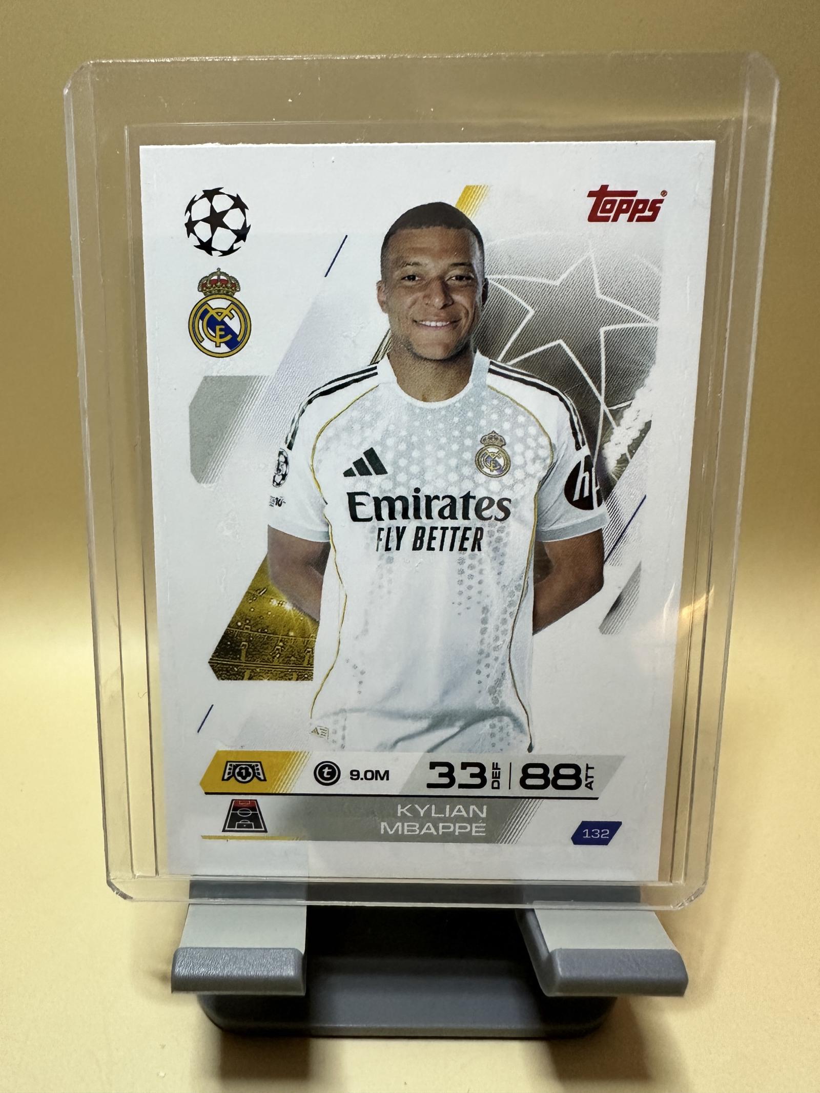 A collectible Topps football card featuring Kylian Mbappe in Real Madrid kit with defensive rating 33 and attack rating 88.