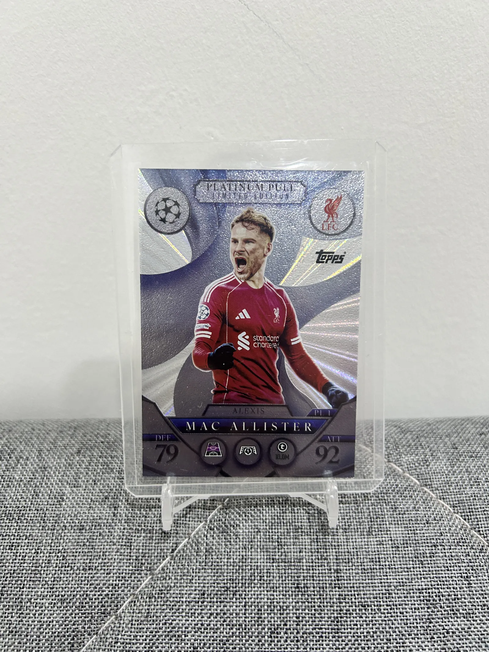 Limited Edition Platinum Pull soccer card featuring Mac Allister from Liverpool. The card showcases holographic and reflective design elements with player stats including DEF 79 and ATT 92. A must-have collectible for Liverpool and soccer card enthusiasts.