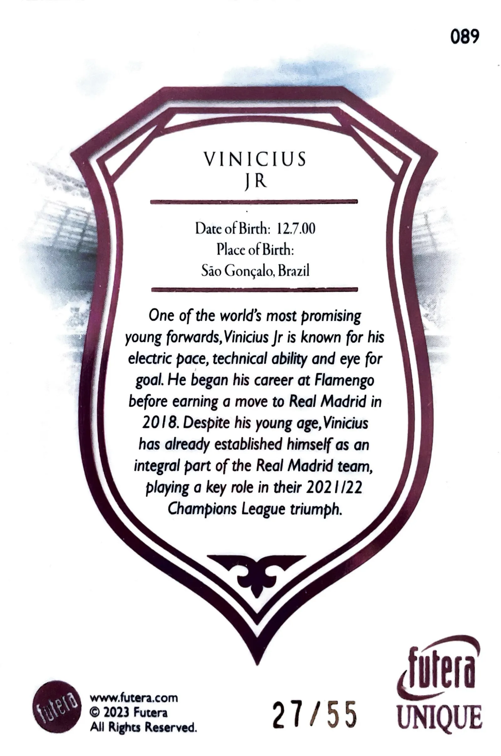 Artist, set and meta value The card is from Futera’s Unique line (2023 Futera Unique). Artist credit is not listed on the card face; Futera releases generally appeal to collectors who value limited-numbered parallels and attractive player art. From a collectible perspective, Vinicius Jr is a high-profile, highly marketable player—his cards typically carry stronger demand than many peers, and a numbered 27/55 increases scarcity for collectors focusing on limited parallels. This is primarily a collectible rather than a play piece; its value is driven by player popularity, low edition size, and condition/grading potential.