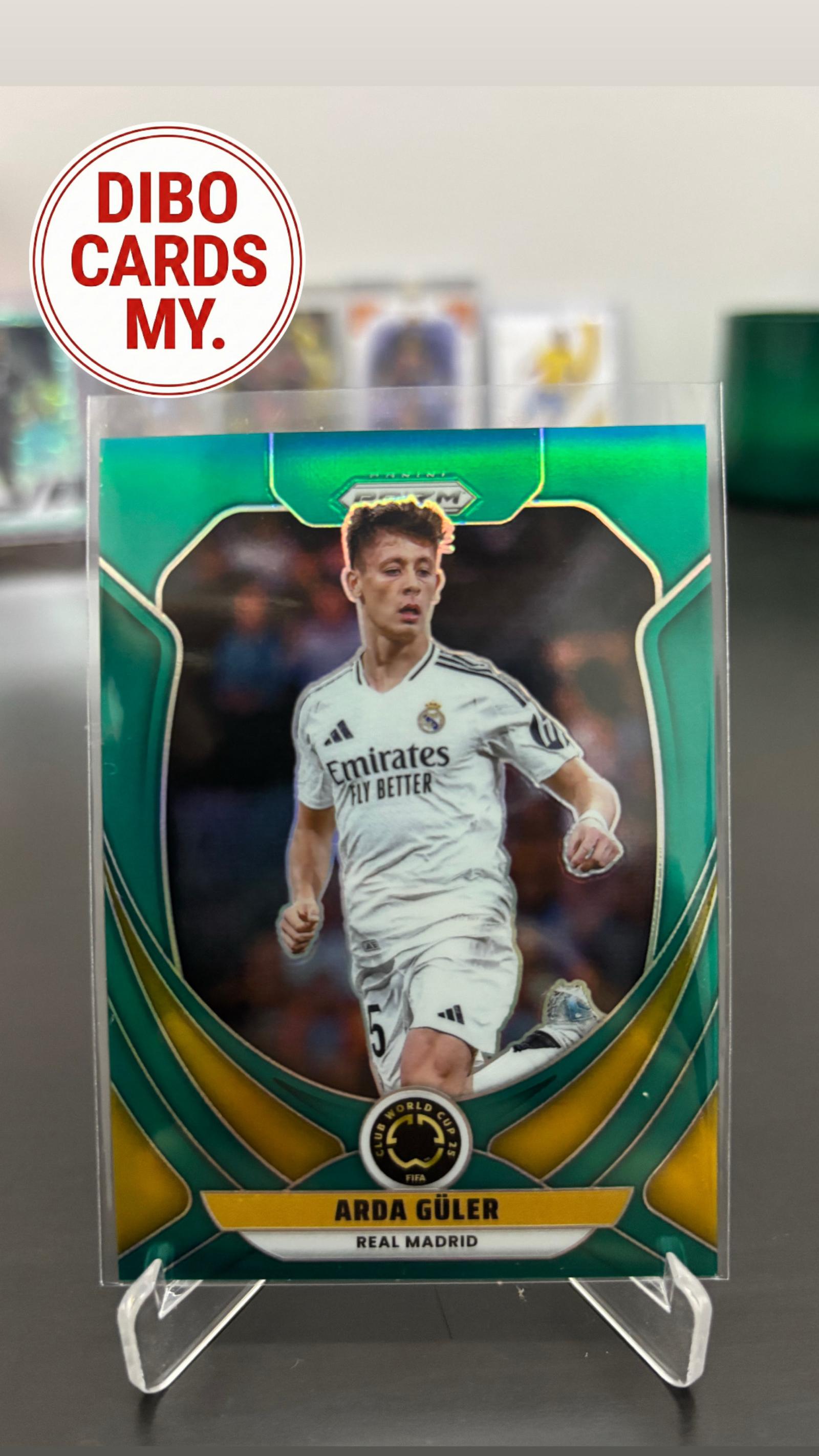 This is a 2025 FIFA Club World Cup trading card featuring Arda Güler in a Real Madrid kit. The card has a green parallel design with a holographic finish, highlighting the player mid-action. It is protected in a clear sleeve and displayed on a stand. Ideal for collectors of football cards or Real Madrid memorabilia.