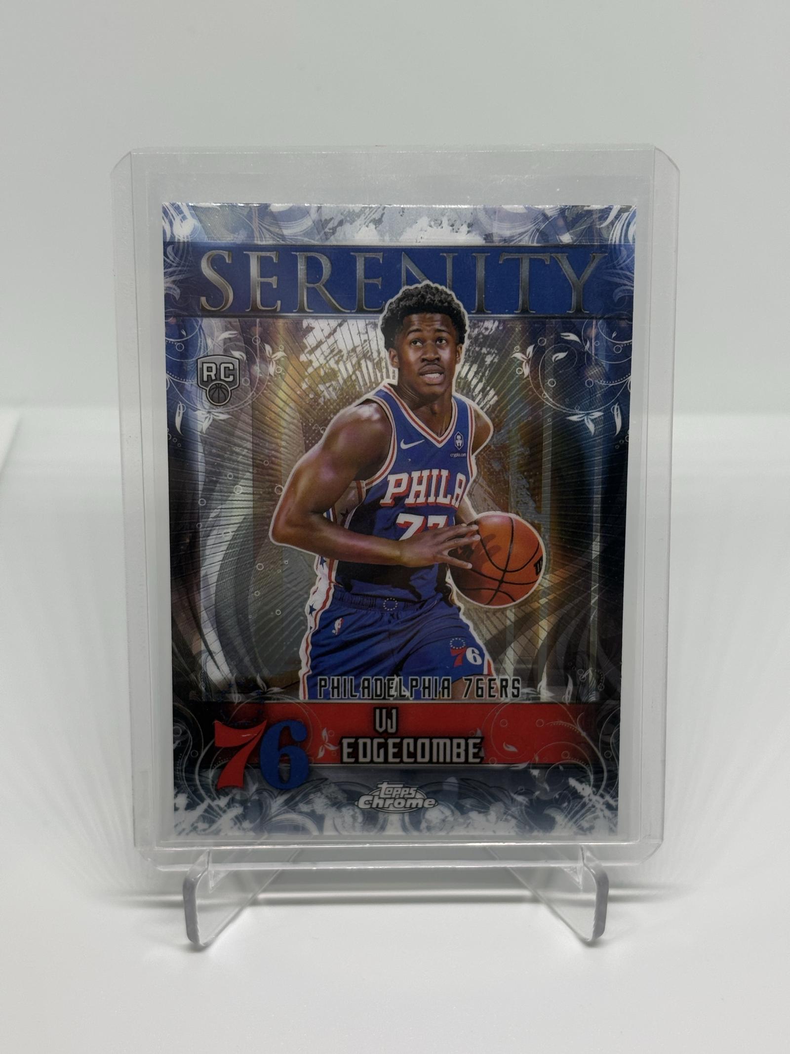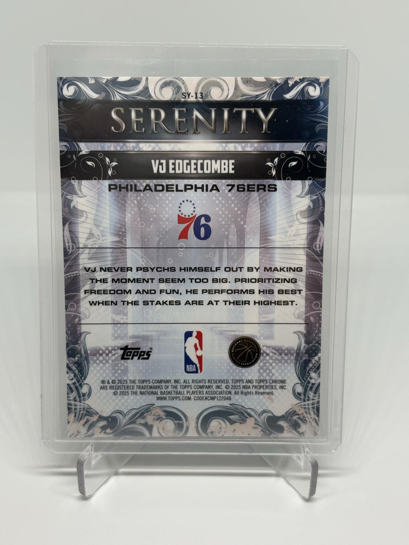 This is a 2023-24 Topps Chrome Serenity rookie card featuring VJ Edgecombe of the Philadelphia 76ers. The card showcases Edgecombe in action, with a striking reflective finish and intricate graphic design. The back of the card includes a brief player description highlighting his calm and focused playing style. Card is protected in a semi-rigid holder for preservation.