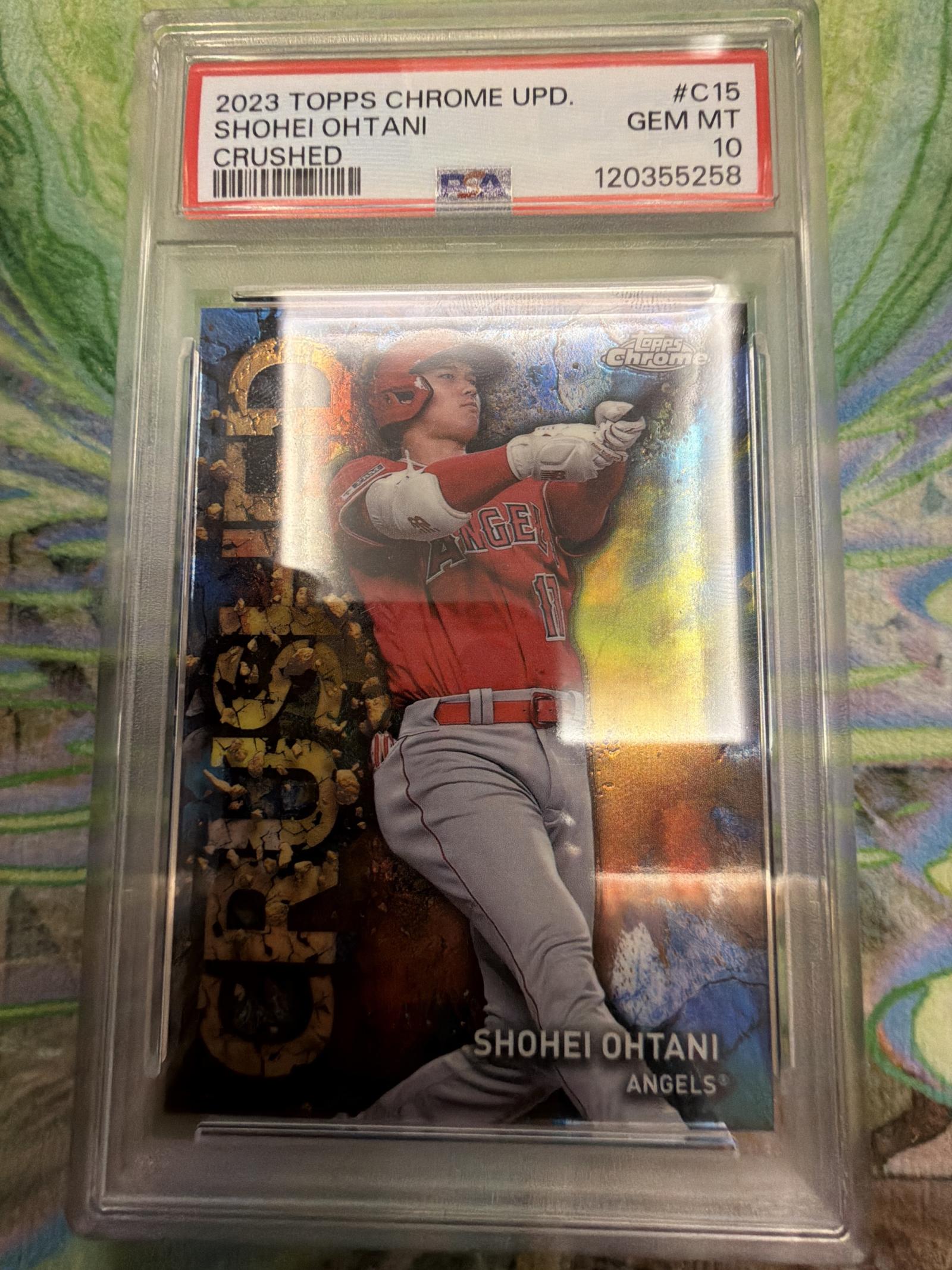This 2023 Topps Chrome Update Shohei Ohtani 'Crushed' #C15 card is professionally graded PSA GEM MT 10, the highest grade possible, ensuring it is in pristine condition. The card features Ohtani in his Angels uniform with a vibrant, high-quality chrome finish. A must-have for collectors and fans of Shohei Ohtani and baseball cards.