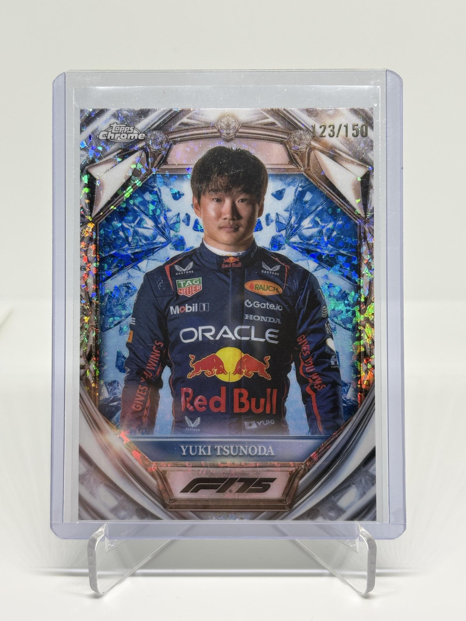 A limited edition 2025 Topps Chrome Formula 1 trading card featuring Yuki Tsunoda in Oracle Red Bull Racing gear. Part of the Diamond 75th Anniversary set, this card is numbered 123 out of 150. The card showcases vibrant holographic effects and is a must-have for F1 and motorsport collectors.