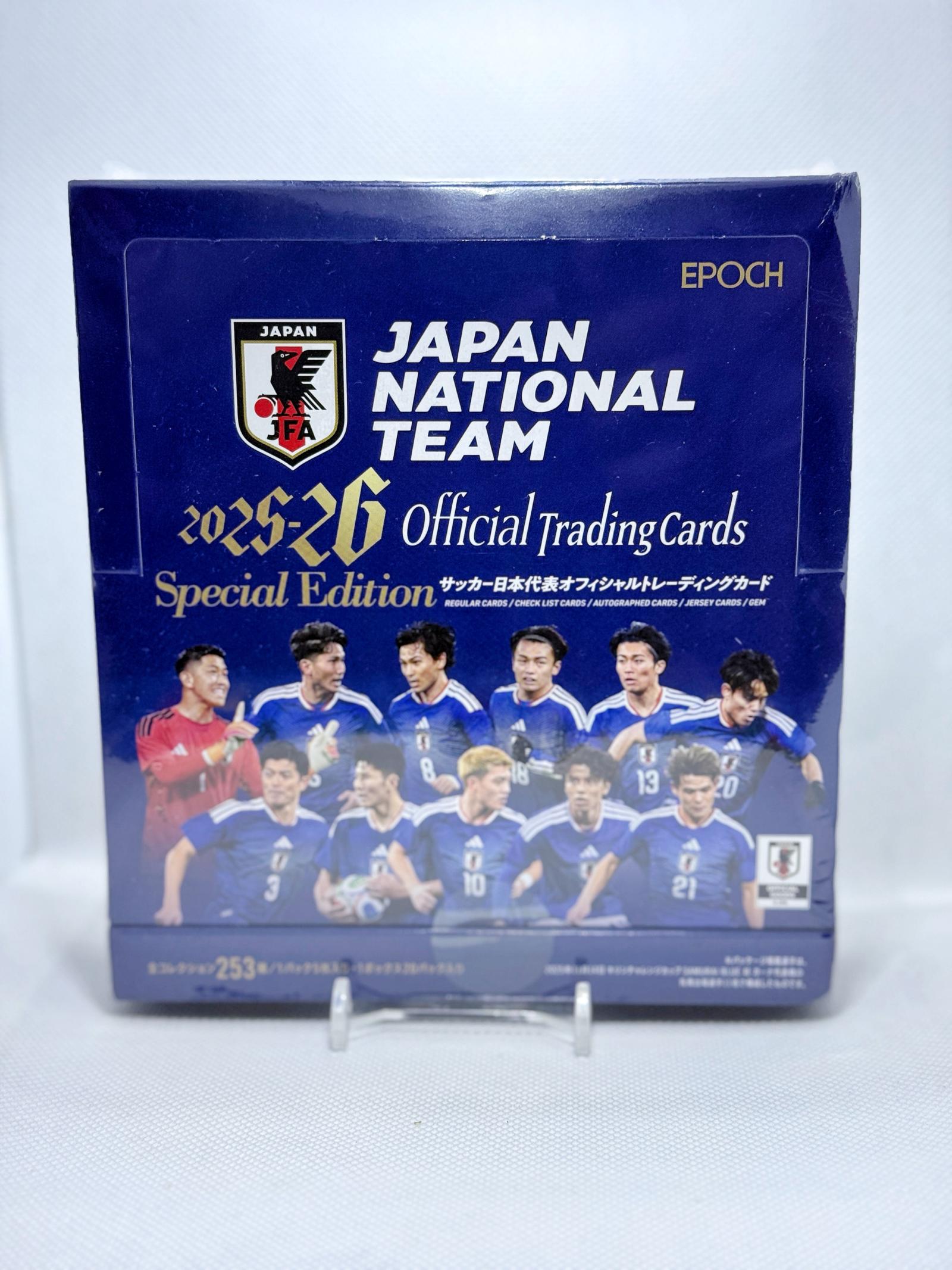 Official Japan National Team 2025-26 Special Edition trading card box by EPOCH. Includes regular cards, checklist cards, autographed cards, jersey cards, and GEM cards. Total of 253 cards in the set. This product is a collectible item featuring Japan's national soccer team.