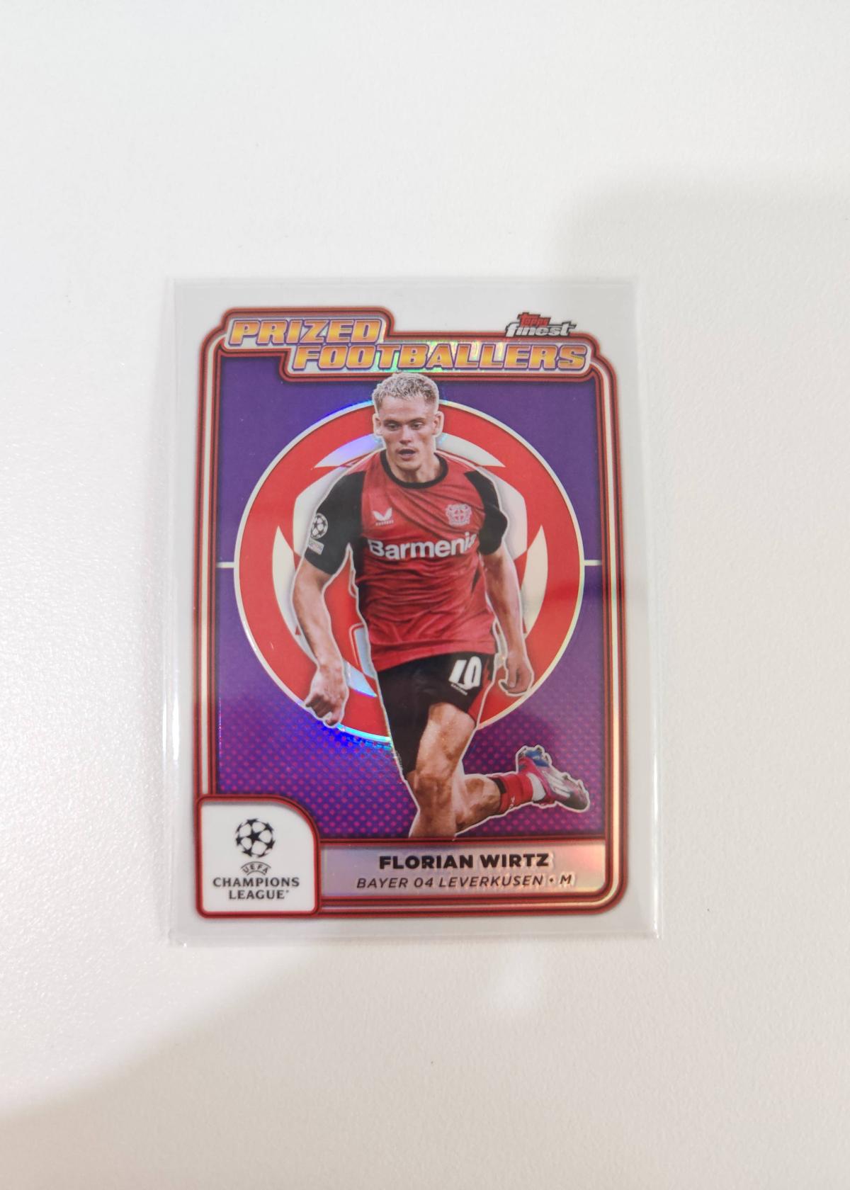 This is a Topps Finest 'Prized Footballers' insert card featuring Florian Wirtz from Bayer 04 Leverkusen in the UEFA Champions League. The card has a foil treatment and is geared towards collectors of football trading cards. Ideal for fans of Florian Wirtz and UEFA Champions League memorabilia. Artist and set number information not available. This product is collectible and not related to Magic: The Gathering.