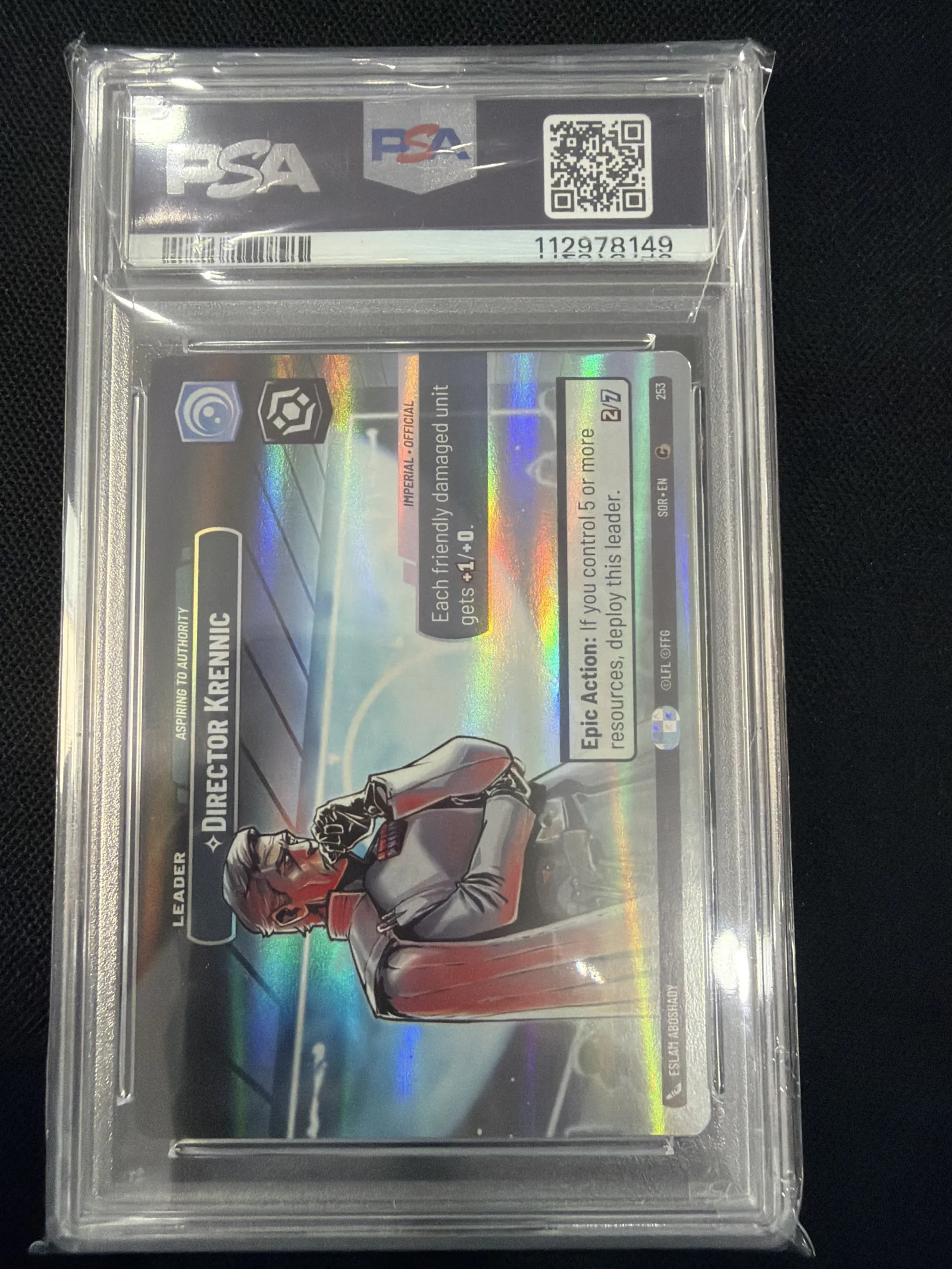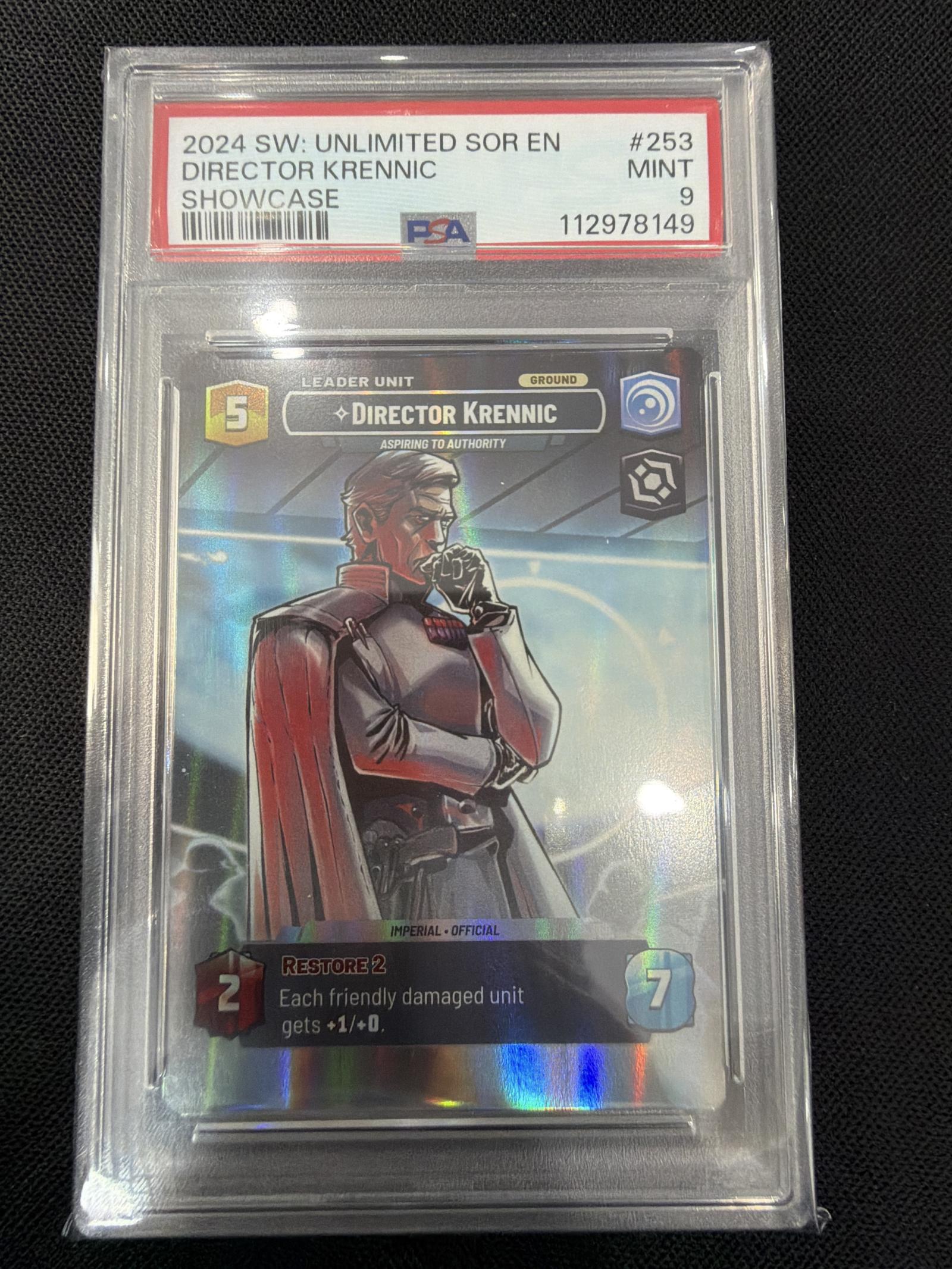 A 2024 Star Wars Unlimited Trading Card Game collectible featuring Director Krennic in a showcase design. This leader unit card is graded PSA 9, indicating mint condition. It includes unique gameplay stats such as Restore 2 and ability to boost friendly damaged units. Encased in a protective PSA slab, ideal for collectors and players.