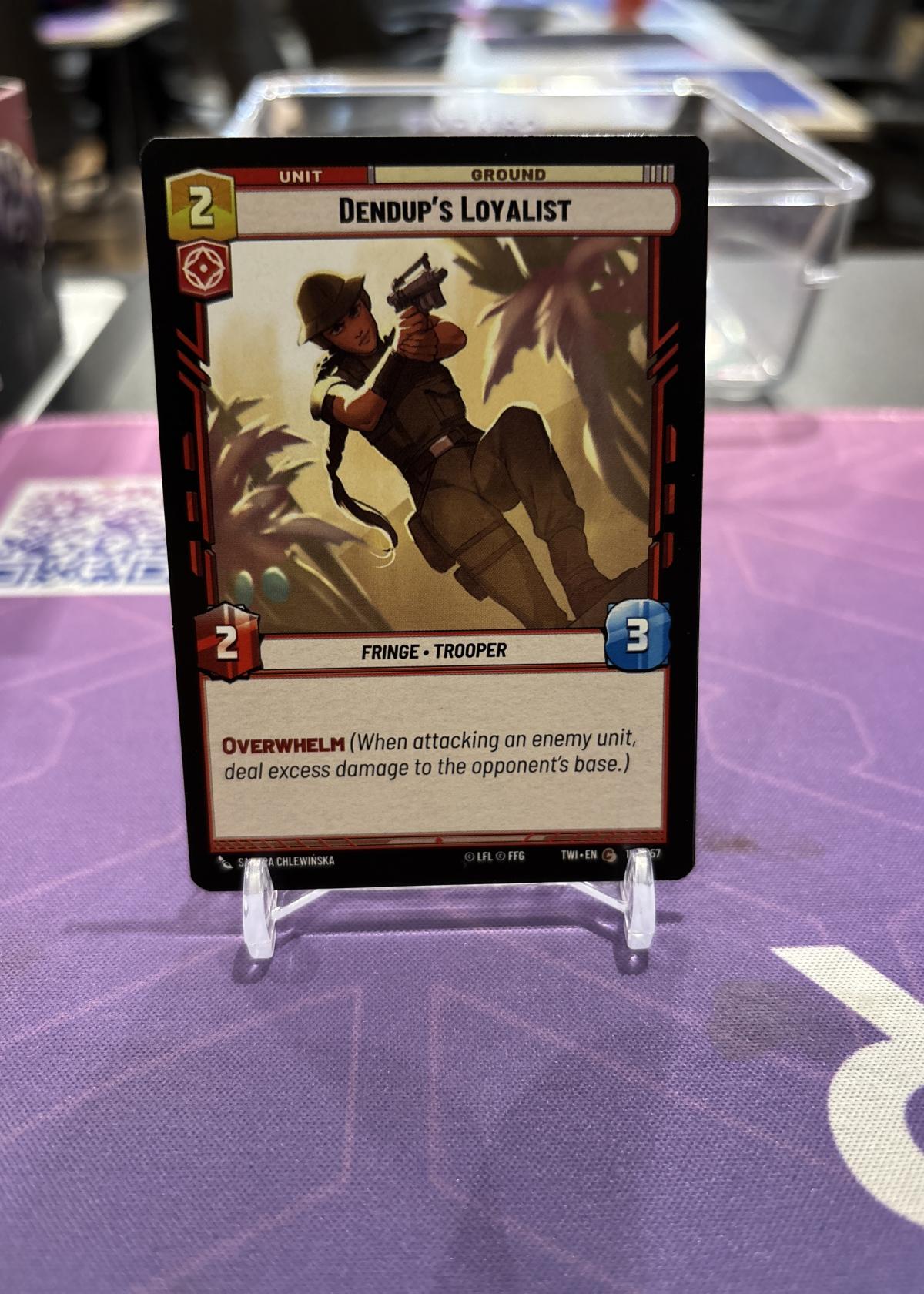 Dendup's Loyalist is a ground unit card from the Star Wars Unlimited Trading Card Game. This card features the keywords 'Fringe' and 'Trooper', with the special ability Overwhelm, allowing excess damage to be dealt to the opponent's base. Ideal for collectors and players seeking to enhance their Star Wars Unlimited deck.