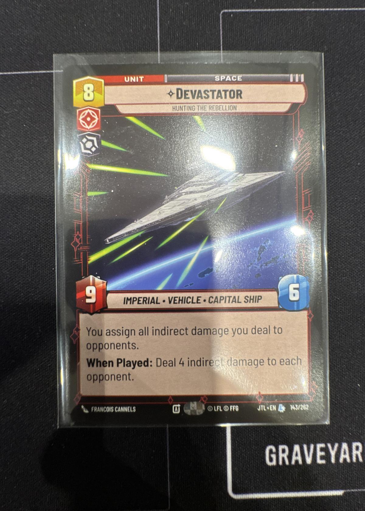 This is a 'Devastator' unit card from the Star Wars Unlimited Trading Card Game. It features an Imperial Capital Ship, classified as an Imperial Vehicle and Capital Ship. The card ability lets you assign all indirect damage you deal to opponents, and when played, it deals 4 indirect damage to each opponent. Artwork by Francois Cannels, card number 143/262.