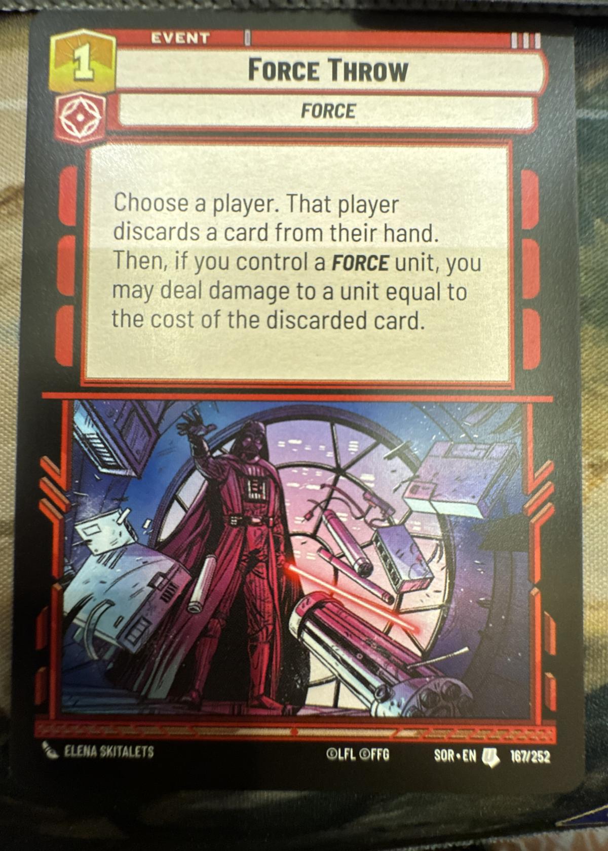 This is a Force Throw event card from the Star Wars Unlimited trading card game. The card features artwork of Darth Vader using the Force. Card effect: 'Choose a player. That player discards a card from their hand. Then, if you control a Force unit, you may deal damage to a unit equal to the cost of the discarded card.' Card number 167/252. Artwork by Elena Skitalets.