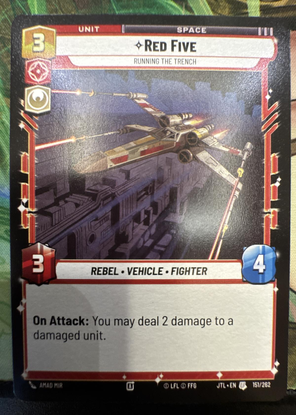 This is a 'Red Five – Running the Trench' unit card from the Star Wars Unlimited Trading Card Game, featuring iconic X-wing trench artwork. The card is labeled REBEL • VEHICLE • FIGHTER and includes the ability: On Attack: You may deal 2 damage to a damaged unit. Card number 151/262. A great addition for collectors or players.
