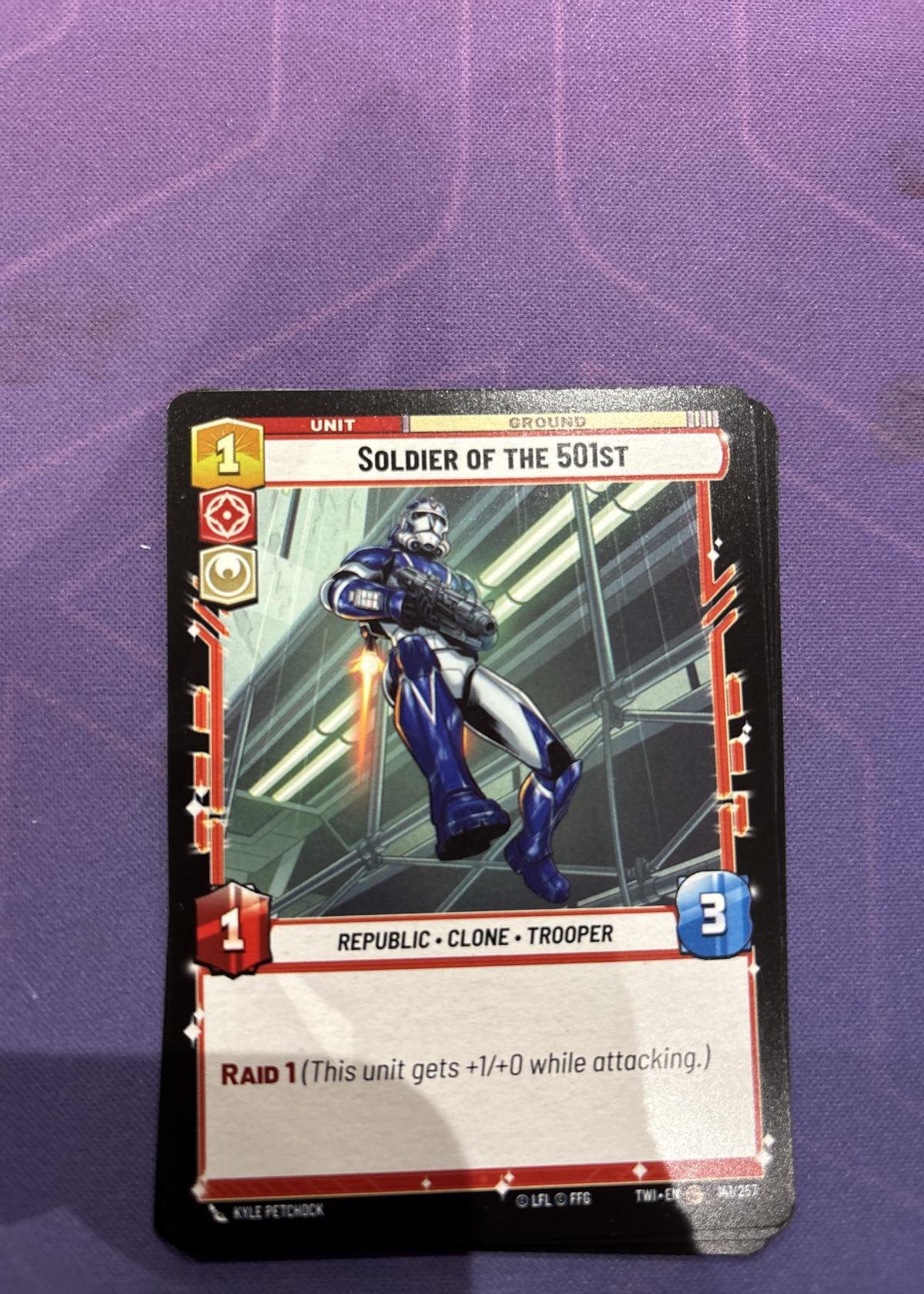 This is a 'Soldier of the 501st' card from the Star Wars Unlimited Trading Card Game. It features a Republic Clone Trooper with the Raid 1 ability, which grants +1 attack while attacking. The card is ideal for collectors or players looking to strengthen their ground unit decks. Card text and borders show little to no visible wear.