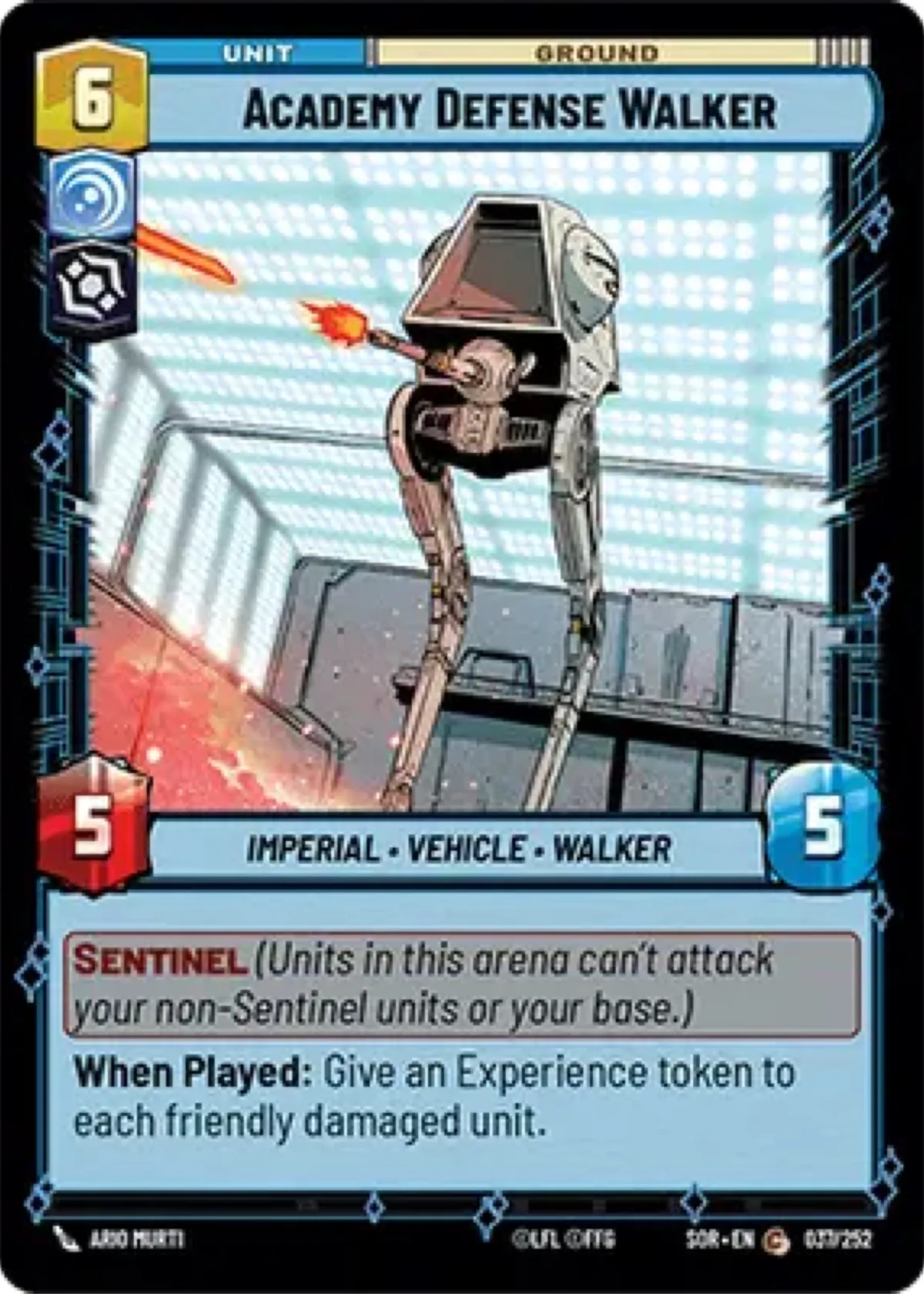 Academy Defense Walker is a unit card from Star Wars Unlimited TCG. Type: Ground, Imperial, Vehicle, Walker. Card features the Sentinel ability and rewards experience tokens for each friendly damaged unit when played. Card number SDR-EN 037/252. Ideal for collectors and players seeking to enhance their Imperial decks.
