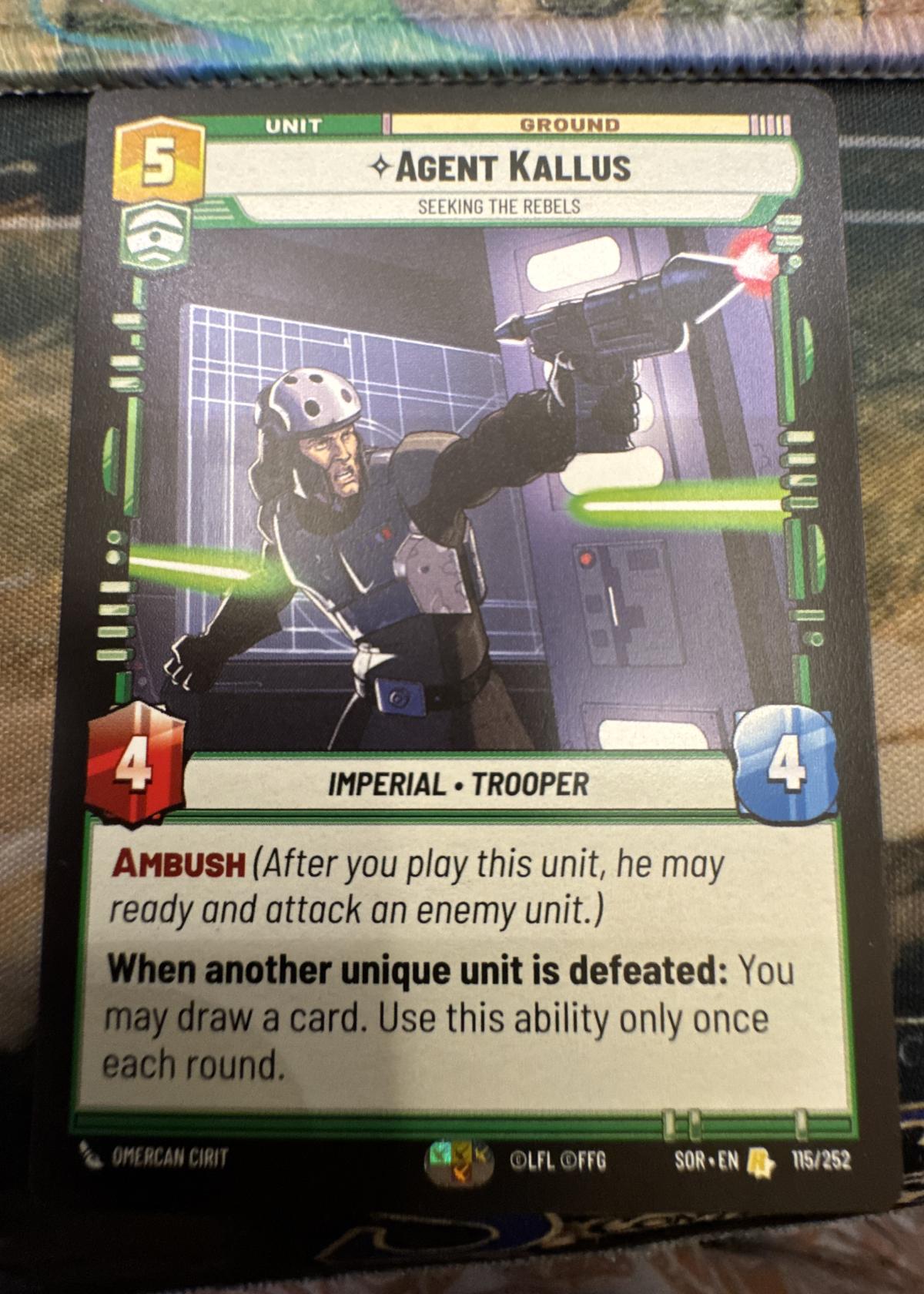 This is an Agent Kallus trading card from the Star Wars Unlimited Trading Card Game. It is a ground unit card featuring the Imperial Trooper with Ambush ability and the card draw perk when another unique unit is defeated. Card number SOR-EN 115/252. Add this strategic piece to your Star Wars Unlimited deck.