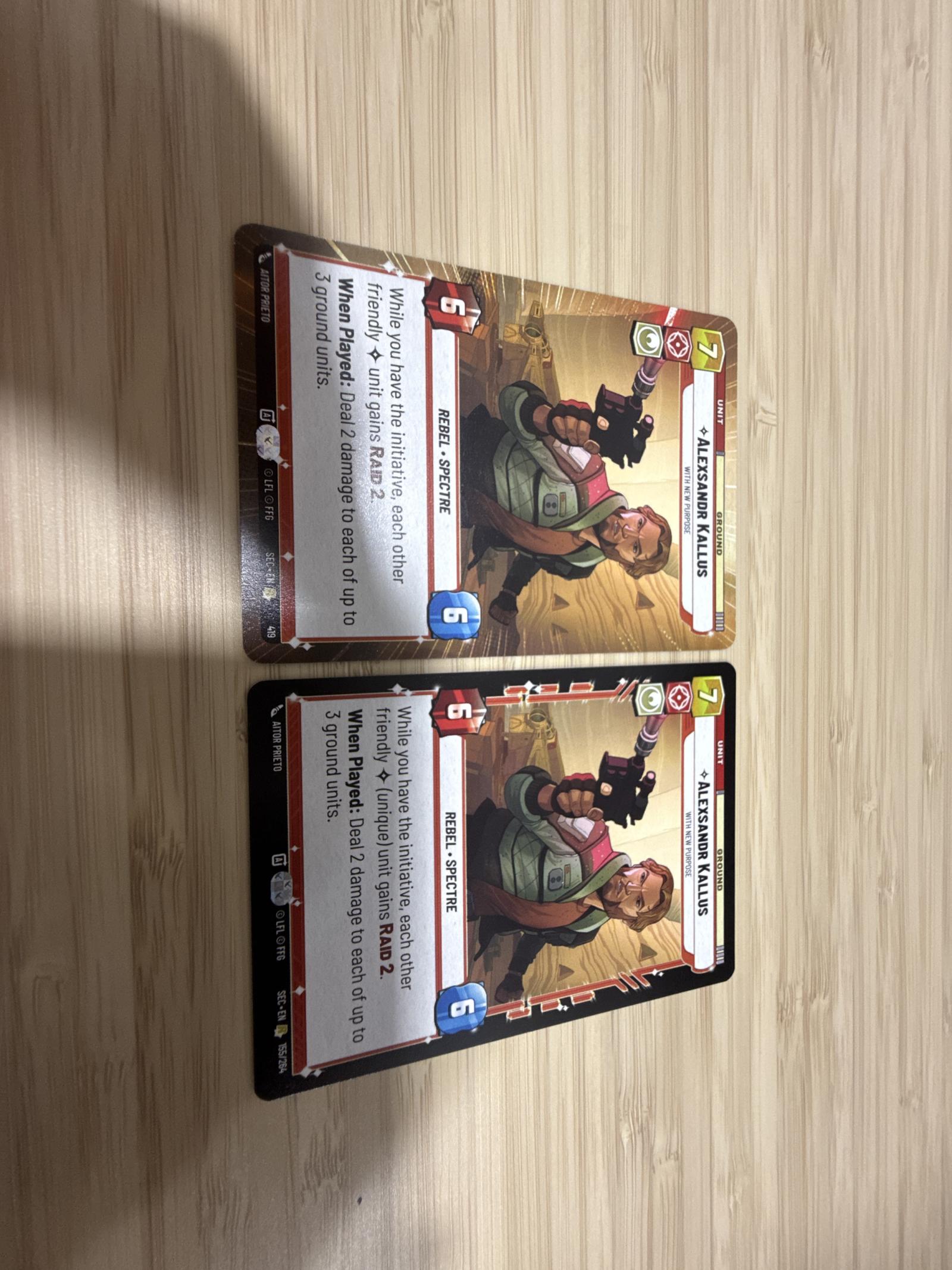 A pair of Aleksandr Kallus Rebel Spectre trading cards from the Star Wars Unlimited TCG. Both cards feature the same artwork and abilities. Cards show minor edge wear but no major creases or damage.
