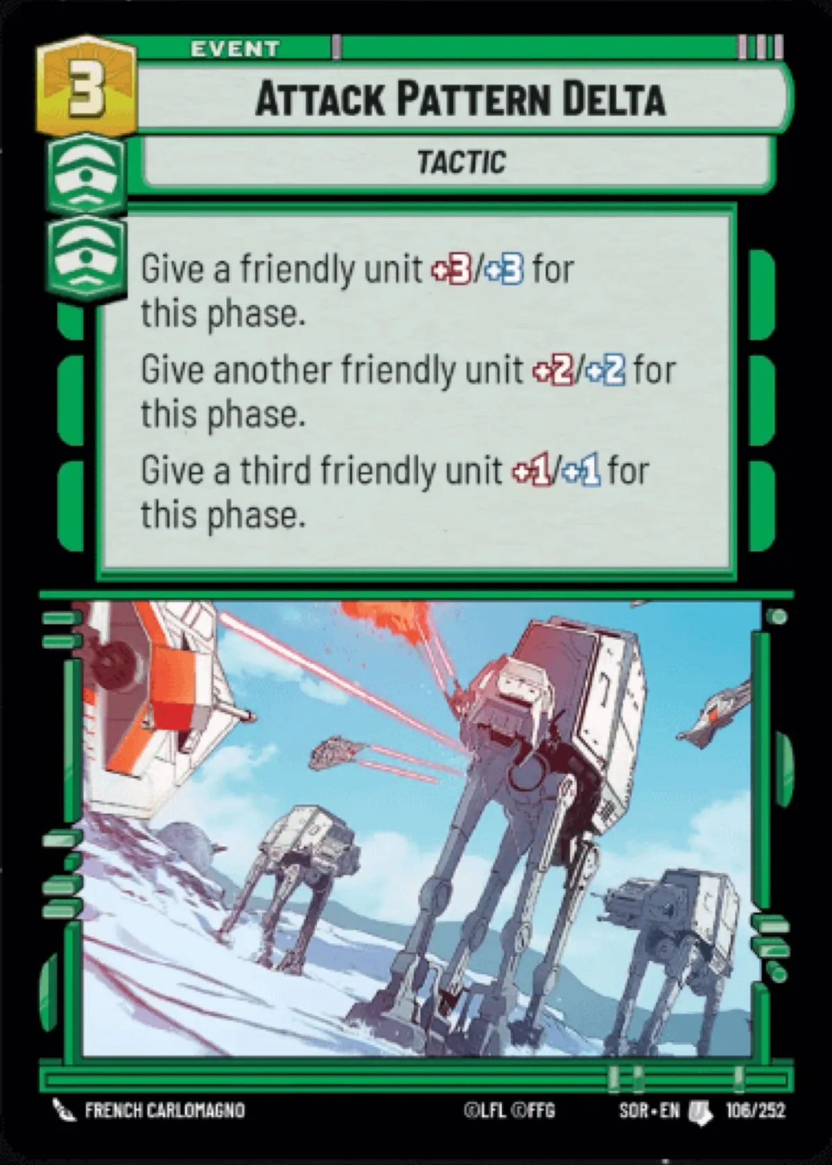 This is an 'Attack Pattern Delta' event card from Star Wars Unlimited (SOR-EN 106/252). Featuring iconic AT-AT walkers from the Star Wars universe, this card allows you to power up three friendly units during a phase, making it a valuable tactic in gameplay. Perfect for collectors and players looking to enhance their Star Wars Unlimited deck.