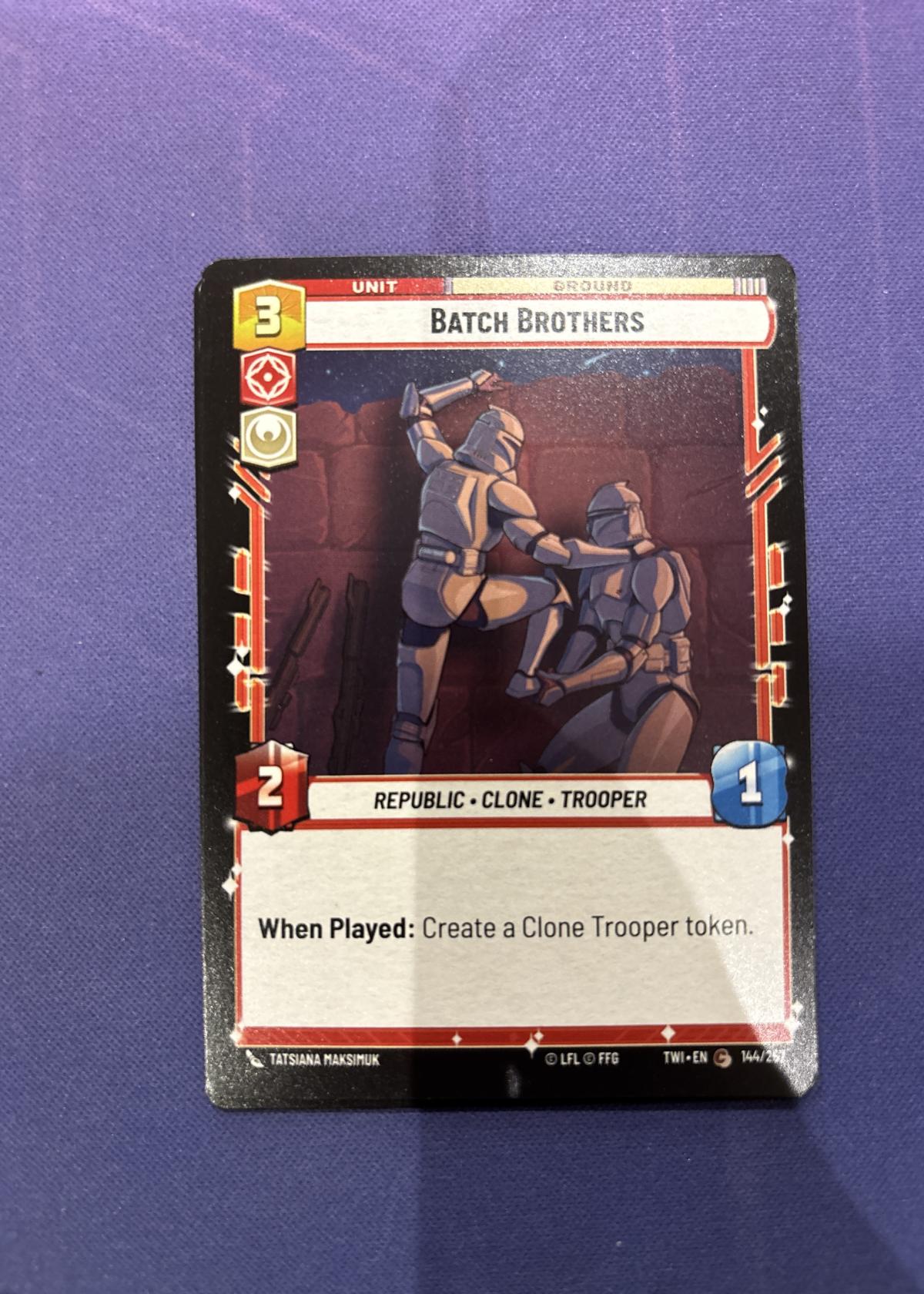 This is a Batch Brothers unit card from the Star Wars Unlimited Trading Card Game, featuring Republic Clone Troopers. The card has a cost of 3 and, when played, creates a Clone Trooper token. The card artwork is by Tatsiana Maksimuk. Great for collectors and players expanding their Star Wars Unlimited decks.