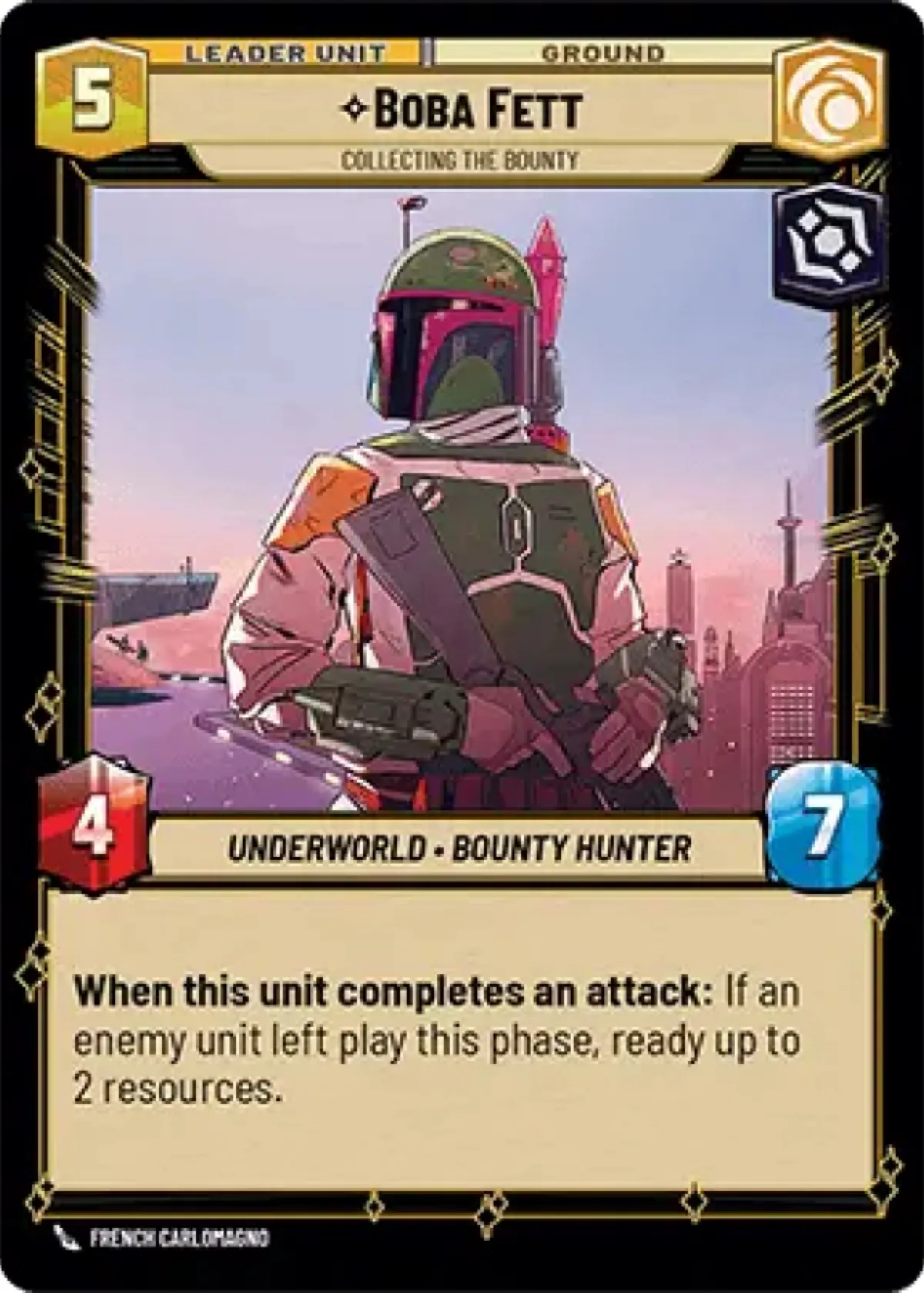 This is a Boba Fett 'Collecting the Bounty' leader unit card from the Star Wars Unlimited trading card game. The card features beautiful artwork by French Carlomagno and character details like cost (5), power (4), and health (7). Text ability: 'When this unit completes an attack: If an enemy unit left play this phase, ready up to 2 resources.' Card edges and surface appear clean and sharp with no visible wear, creasing, or damage.