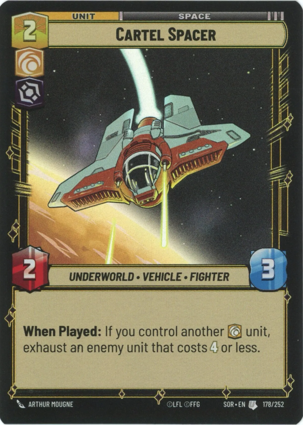 Cartel Spacer is a Unit (Space) card from the Star Wars Unlimited trading card game. This card belongs to the Underworld, Vehicle, and Fighter archetypes. Its ability allows you to exhaust an enemy unit that costs 4 or less when played if you control another Underworld unit. Card number 178 out of 252, illustrated by Arthur Mougne.
