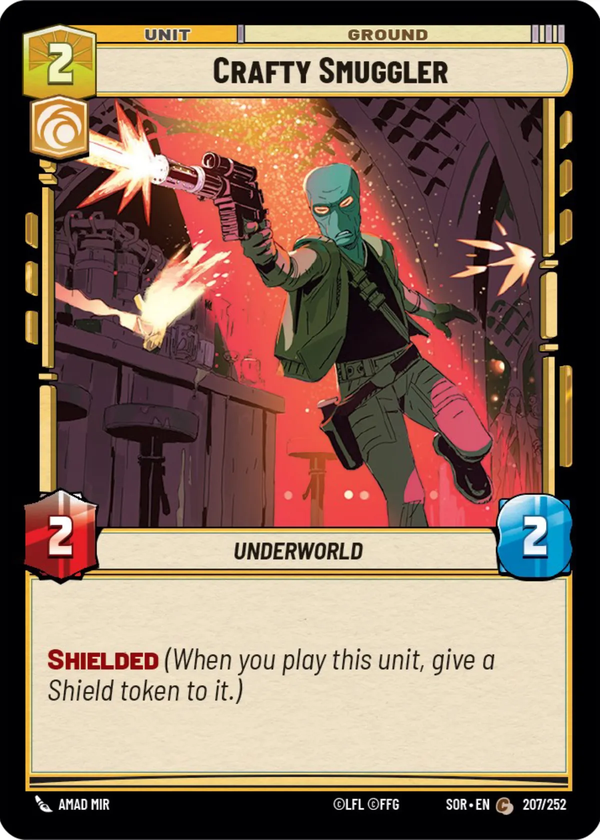 This is a Crafty Smuggler unit card from the Star Wars Unlimited trading card game, set SOR, numbered 207/252. The card features the Underworld trait and the 'Shielded' ability. A great addition for collectors or players looking to enhance their deck with a common ground unit.