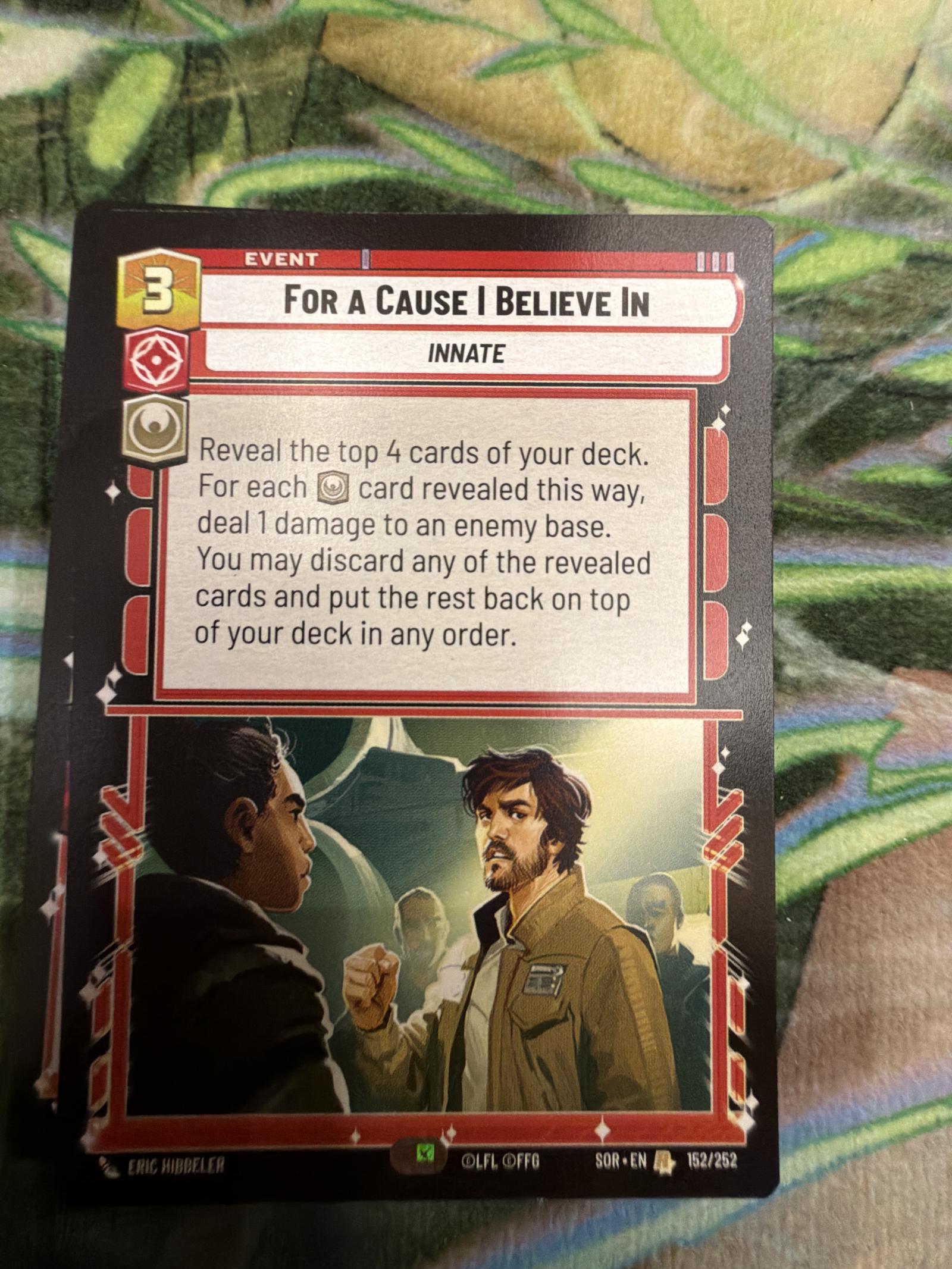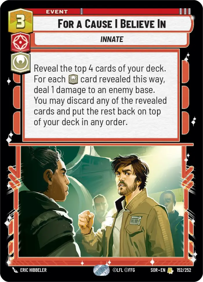 A 'For a Cause I Believe In' Innate event card from Star Wars Unlimited, featuring artwork by Eric Biddleler. This card allows revealing the top 4 cards of your deck to deal damage to an enemy base based on resource cards revealed. Card number 152 out of 252 in the set.