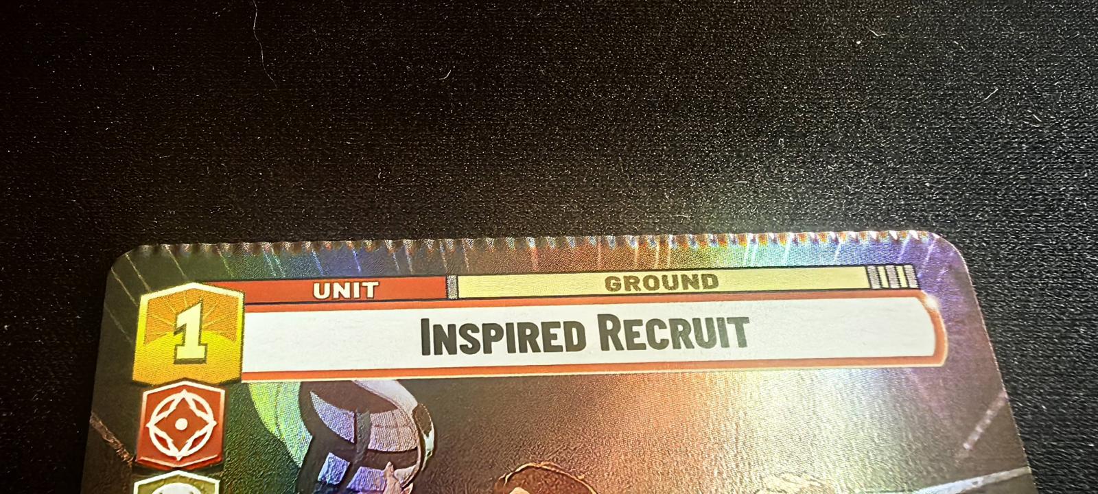 A foil Star Wars Unlimited trading card, 'Inspired Recruit,' featuring a Rebel Trooper unit. The card has an obvious miscut on the top. Special collection for those who like to collect misprint or error cards
